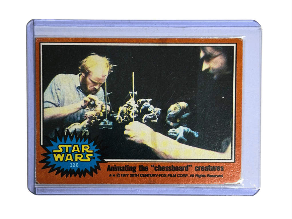 1977 STAR WARS CARD #326 – BEHIND THE SCENES: CREATURE ANIMATIONA Behind-The-Scenes Look At The Animators Working On The Iconic Dejarik Chessboard Scene Aboard The Millennium Falcon. Brown-Bordered Card #326.- 1977 Topps Star Wars Series- Card #326 – Brown Border- Behind-The-Scenes Creature Effects584901+60