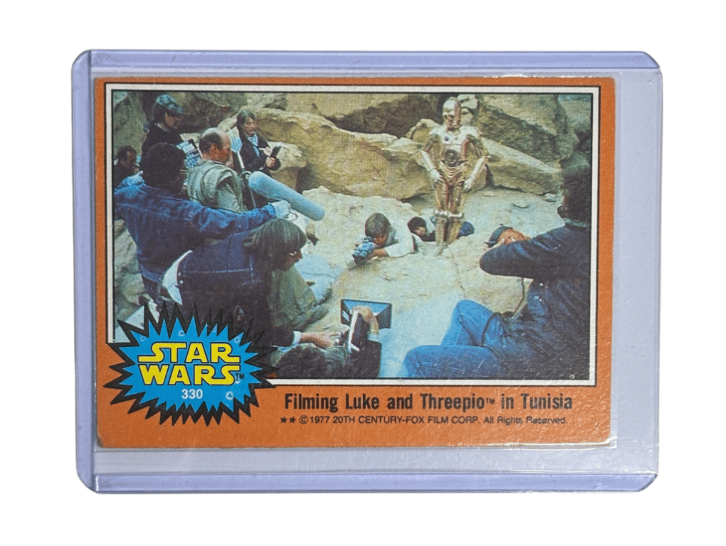1977 STAR WARS CARD #330 – FILMING IN TUNISIA BTSA Fantastic Behind-The-Scenes Card Featuring The Tatooine Desert Shoot With Anthony Daniels As C-3Po. Card #330 From The Brown-Bordered Series.- 1977 Topps Star Wars Series- Card #330 – Brown Border- Filming Location: Tunisia584901+63