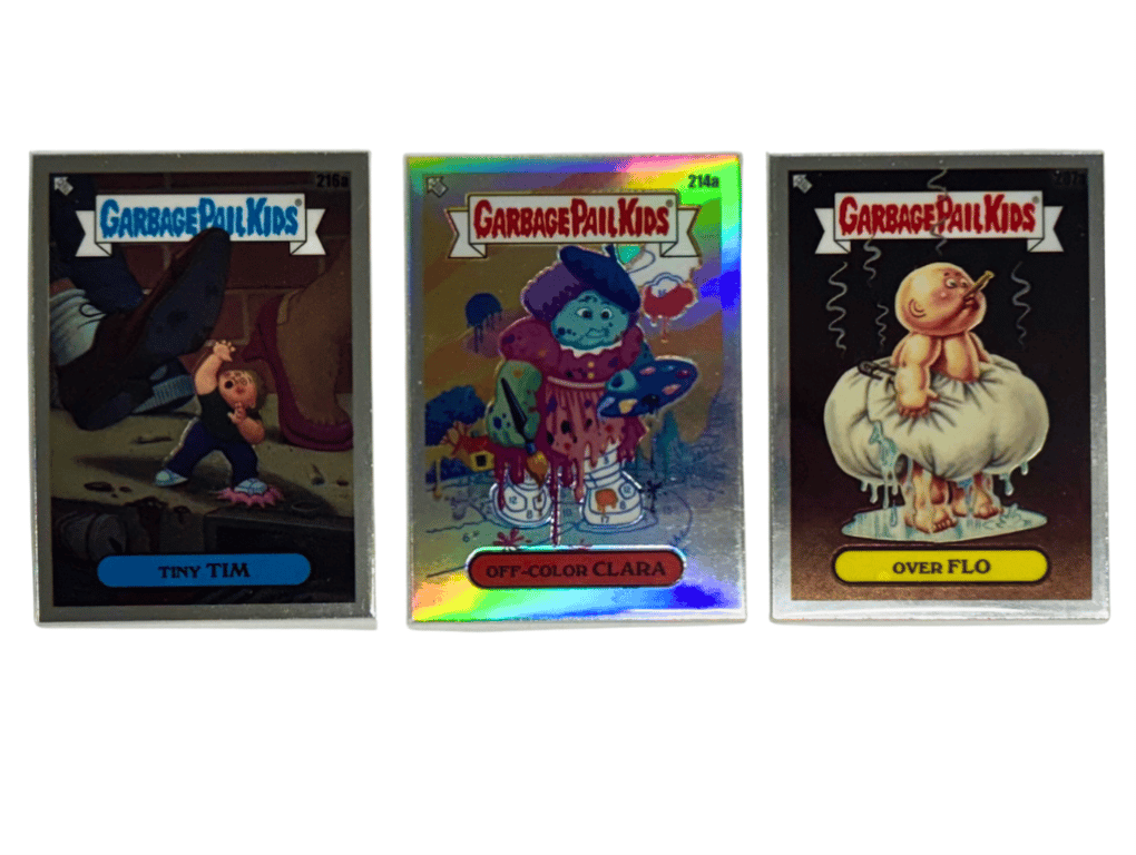 GARBAGE PAIL KIDS CHROME LOT #2 – TINY TIM, OFF-COLOR CLARA, OVER FLOThis Hilarious And Slightly Disturbing Lot Includes Tiny Tim Being Stomped Flat, Off-Color Clara In Full Meltdown, And Over Flo With Some Serious Leakage Issues. A Must For Fans Of Garbage Pail Kids’ Gross-Out Legacy.- Garbage Pail Kids Chrome Refractor Cards- Cards: 215A Tiny Tim, 214A Off-Color Clara, 207B Over Flo- Shiny, Collectible Topps Chrome Finish584901+46