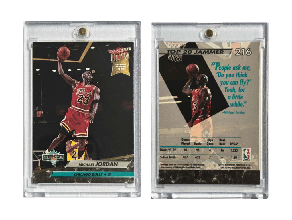 1992 MICHAEL JORDAN FLEER ULTRA CARD #216 – "TOP 20 JAMMER" INSERTThis 1992-93 Fleer Ultra Basketball Card Features The Legendary Michael Jordan In A Soaring Dunk Pose From The "Top 20 Jammer" Insert Series. A Highly Collectible Piece From Mj'S Prime Years With A Powerful Quote On The Back: “People Ask Me, ‘Do You Think You Can Fly?’ Yeah, For A Little While.”- 1992-93 Fleer Ultra Insert Card- Michael Jordan #216 "Top 20 Jammer"- Chicago Bulls – Hall Of Fame LegendSize: Condition: Good - Refer To Images+6