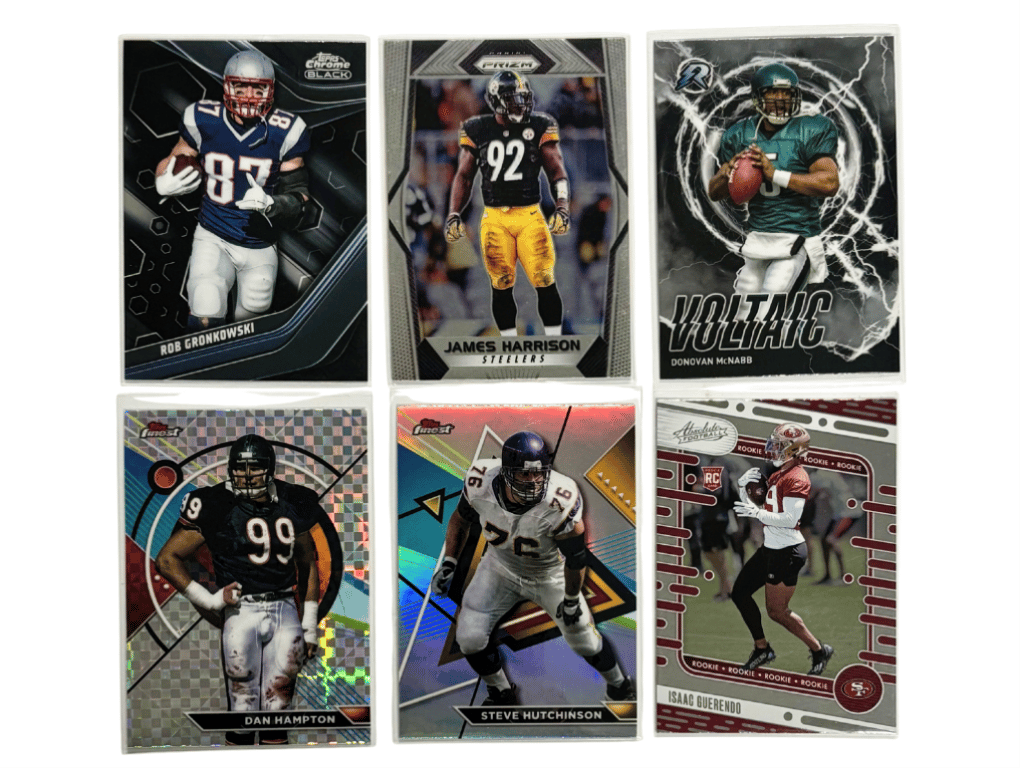 NFL FOOTBALL CARD LOT – 6 CARDS INCL. GRONKOWSKI, HARRISON, MCNABB & MOREThis Six-Card Nfl Lot Includes A Great Mix Of Modern Stars And Legends Across Various Topps, Panini, And Absolute Football Sets. Perfect For Collectors Or Fans Of These Iconic Players.Includes:Rob Gronkowski (Topps Chrome Black)James Harrison (Prizm)Donovan Mcnabb (Voltaic Insert)Dan Hampton (Finest Refractor)Steve Hutchinson (Finest)Isaac Guerendo Rookie (Absolute Football)Size: Condition: Good - Refer To Images+7