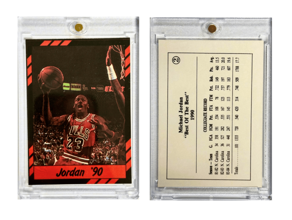1990 MICHAEL JORDAN COLLEGIATE TRIBUTE CARD – “BEST OF THE BEST” #2This Unofficial Tribute Card Features Michael Jordan In Mid-Air During His Bulls Era, With The Reverse Displaying His Full Ncaa Career Stats At North Carolina. A Fan-Made Collectible From The Early 90S Basketball Boom.- Michael Jordan Card #2- “Best Of The Best” 1990 Issue- Ncaa Stats On Back (1981–1984)Size: Condition: Good - Refer To Images+12