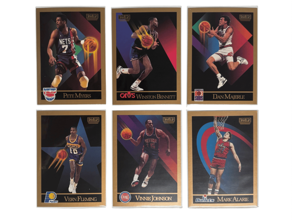 1990 SKYBOX NBA CARD LOT (X6) – PETE MYERS, VINNIE JOHNSON & MORESix Colorful Cards From The Iconic 1990 Skybox Set Featuring Mid-Tier Nba Stars From The Era. Cards Come From Teams Like The Nets, Pistons, Suns, And Pacers – Packed With 90S Basketball Style.Includes:Pete Myers (Nets)Winston Bennett (Cavs)Dan Majerle (Suns)Vern Fleming (Pacers)Vinnie Johnson (Pistons)Mark Alarie (Bullets)Size: Condition: Good - Refer To Images+25