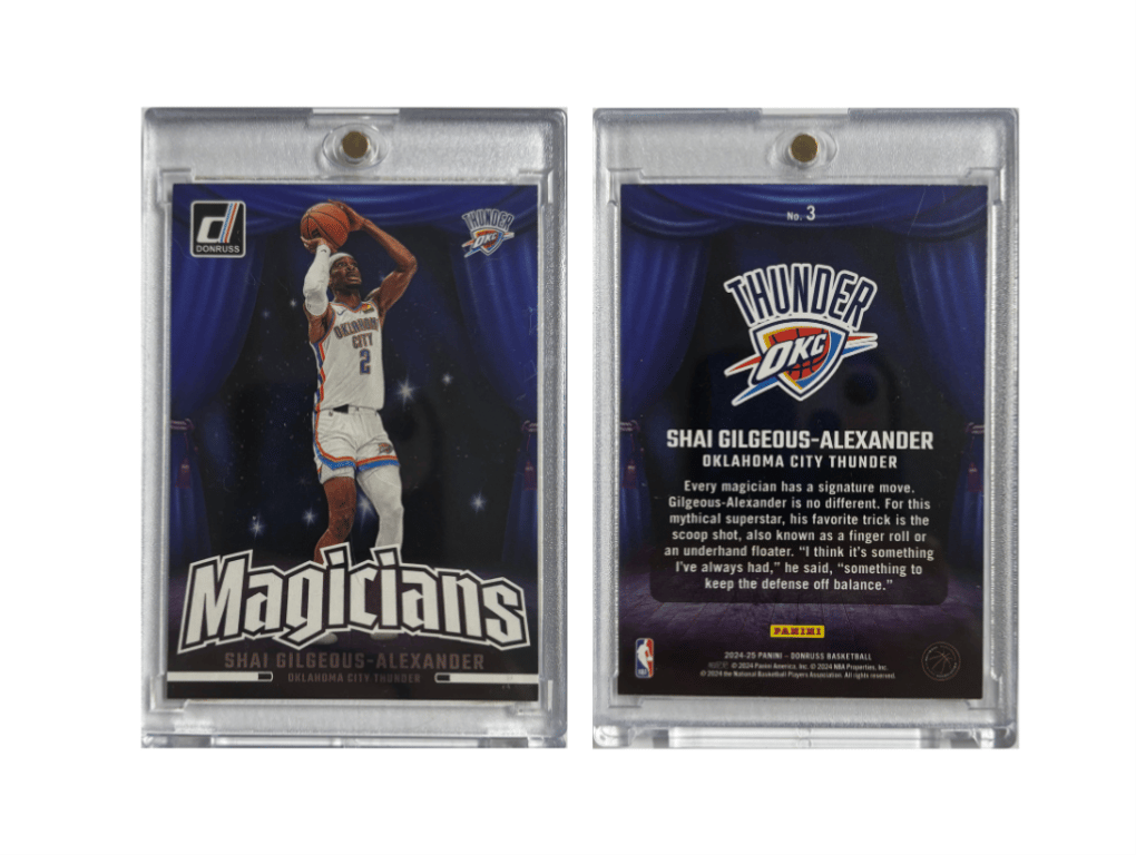 2024 DONRUSS MAGICIANS INSERT – SHAI GILGEOUS-ALEXANDER #3This “Magicians” Insert From 2024-25 Donruss Highlights Okc Thunder’S Shai Gilgeous-Alexander. The Card Features A Theatrical Design And Includes A Player Profile That Showcases His Court Wizardry.- 2024-25 Donruss Magicians Insert #3- Shai Gilgeous-Alexander – Oklahoma City Thunder- Themed Foil Background With Curtain Effect- Dynamic Action Shot And ProfileSize: Condition: Good - Refer To Images+28