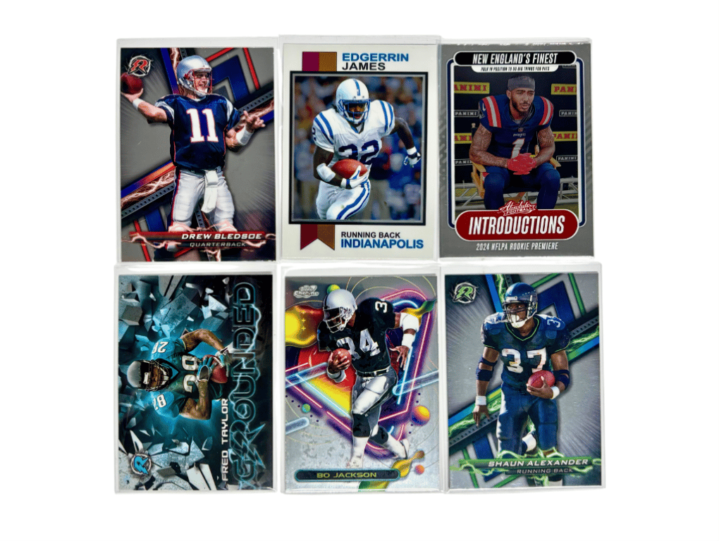 NFL FOOTBALL CARD LOT (X6) – INCLUDES BO JACKSON, BLEDSOE, ALEXANDERA Diverse 6-Card Nfl Lot Featuring Stars And Legends Like Bo Jackson, Drew Bledsoe, Fred Taylor, Shaun Alexander, And Edgerrin James. Includes A Variety Of Brands And Finishes From Across Eras.- Includes Bo Jackson, Bledsoe, Fred Taylor, Shaun Alexander- Mix Of Topps Chrome, Panini, And Absolute- Some Foil And Refractor-Style Cards- Great Starter Lot Or Binder FillerSize: Condition: Good - Refer To Images+29