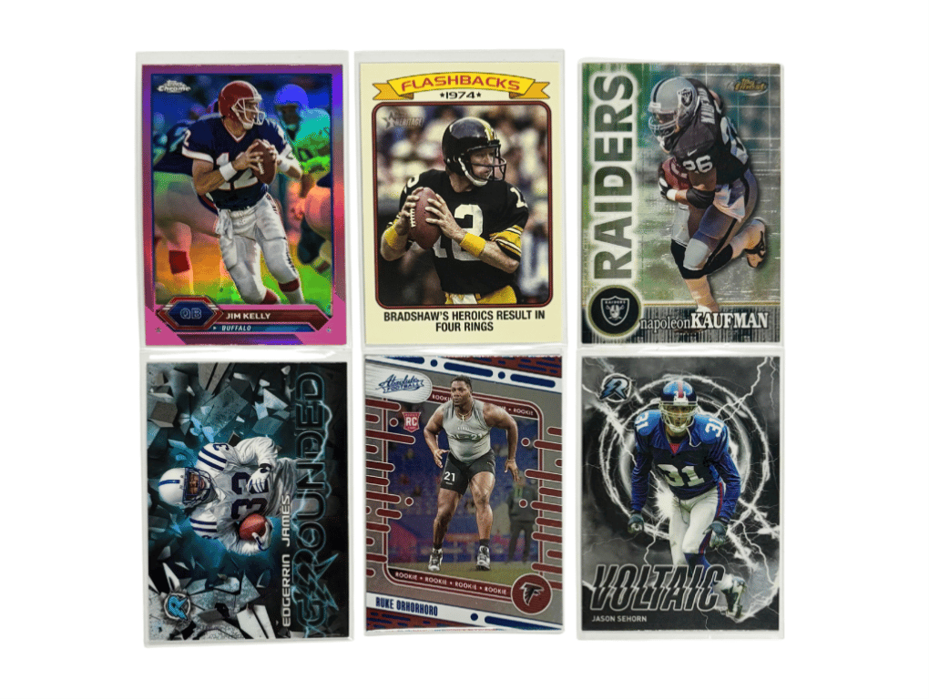 NFL FOOTBALL CARDS (6) – BRADSHAW, KELLY, KAUFMAN & MORE6-Card Nfl Lot Featuring A Mix Of Vintage And Modern Inserts, Including Terry Bradshaw, Jim Kelly, Steve Mcnair, And Others. Dynamic Designs And Collector Appeal Across Decades.- 6 Football Cards- Stars Include Bradshaw, Kelly, Mcnair- Mix Of Topps, Panini, And Themed InsertsSize: Condition: Good - Refer To Images+80