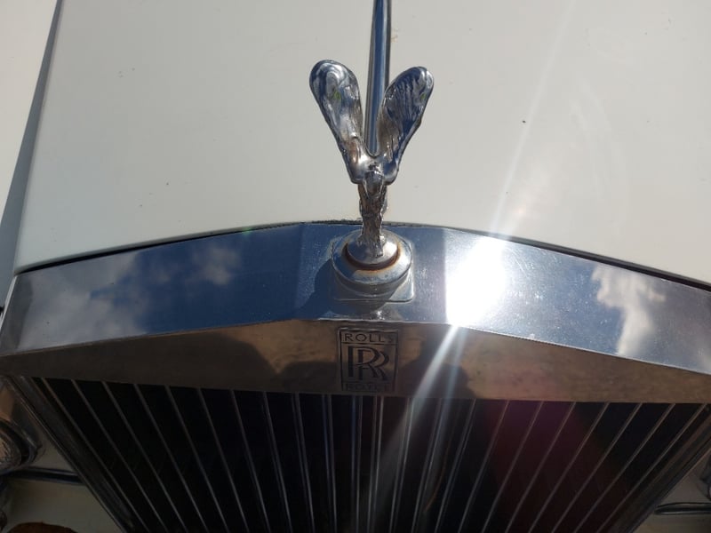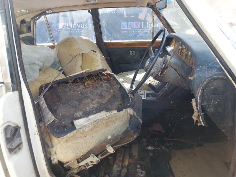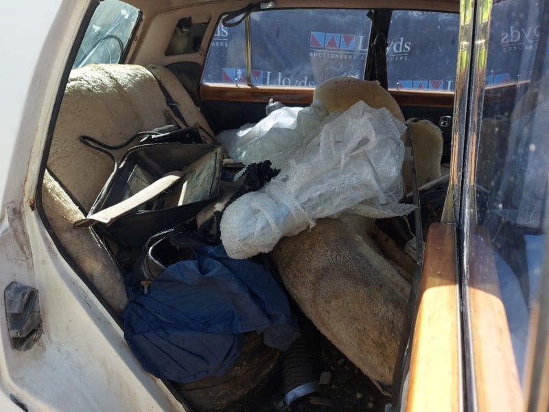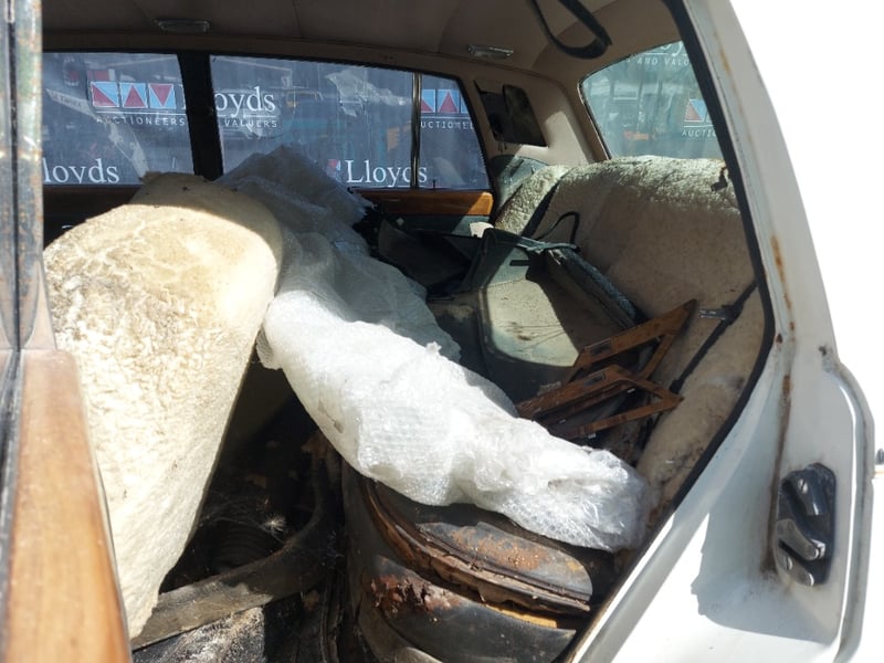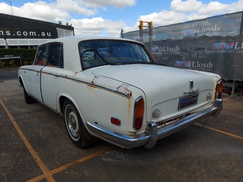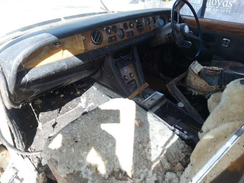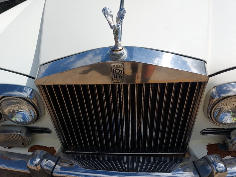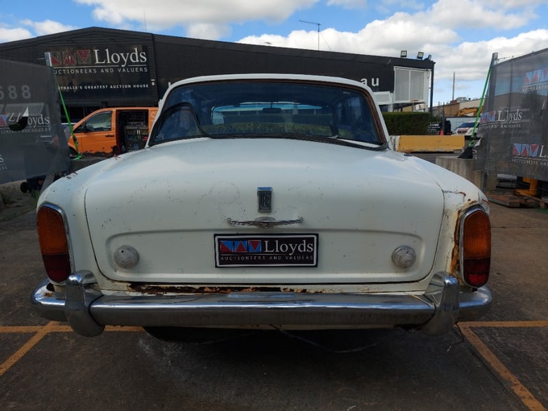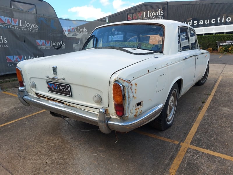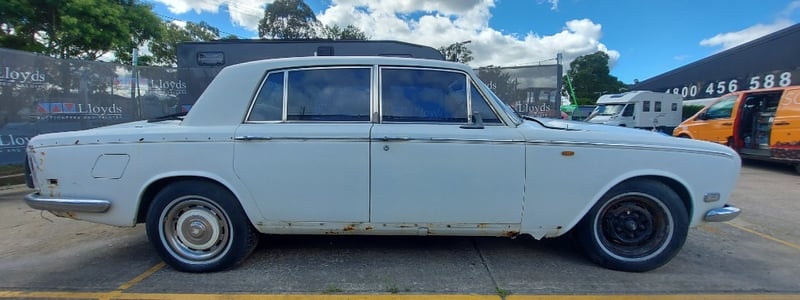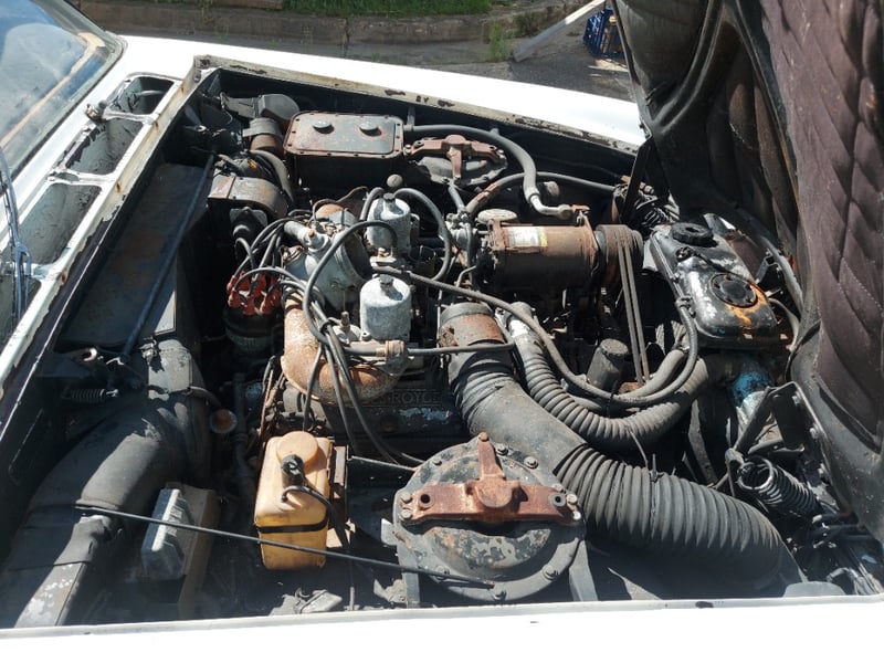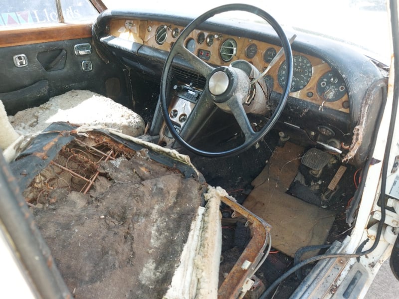 A classic Rolls-Royce project vehicle finished in White, presenting as a non-running restoration candidate with age-related deterioration throughout.