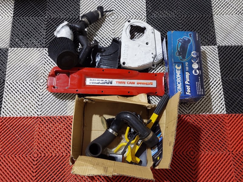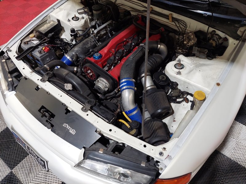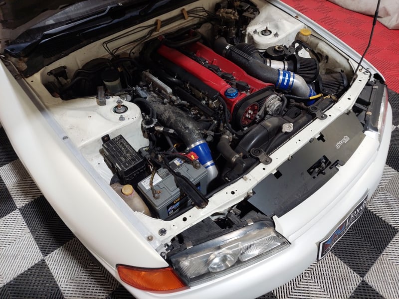 Engine has been fully rebuilt with CP forged internals and has covered less than 5,000 km since rebuild. Features rebuilt and high‑flowed N1 turbochargers with steel turbines, ceramic‑coated custom dump pipes, Tomei Type‑B Poncams, 1250cc injectors, R35 GT‑R coil packs, Haltech Elite 2000 ECU with wideband kit, Walbro 455 LPH E85‑compatible fuel pump, Plazmaman fuel rail, N1 oil pump, baffled sump, and reconditioned ATTESA pump.