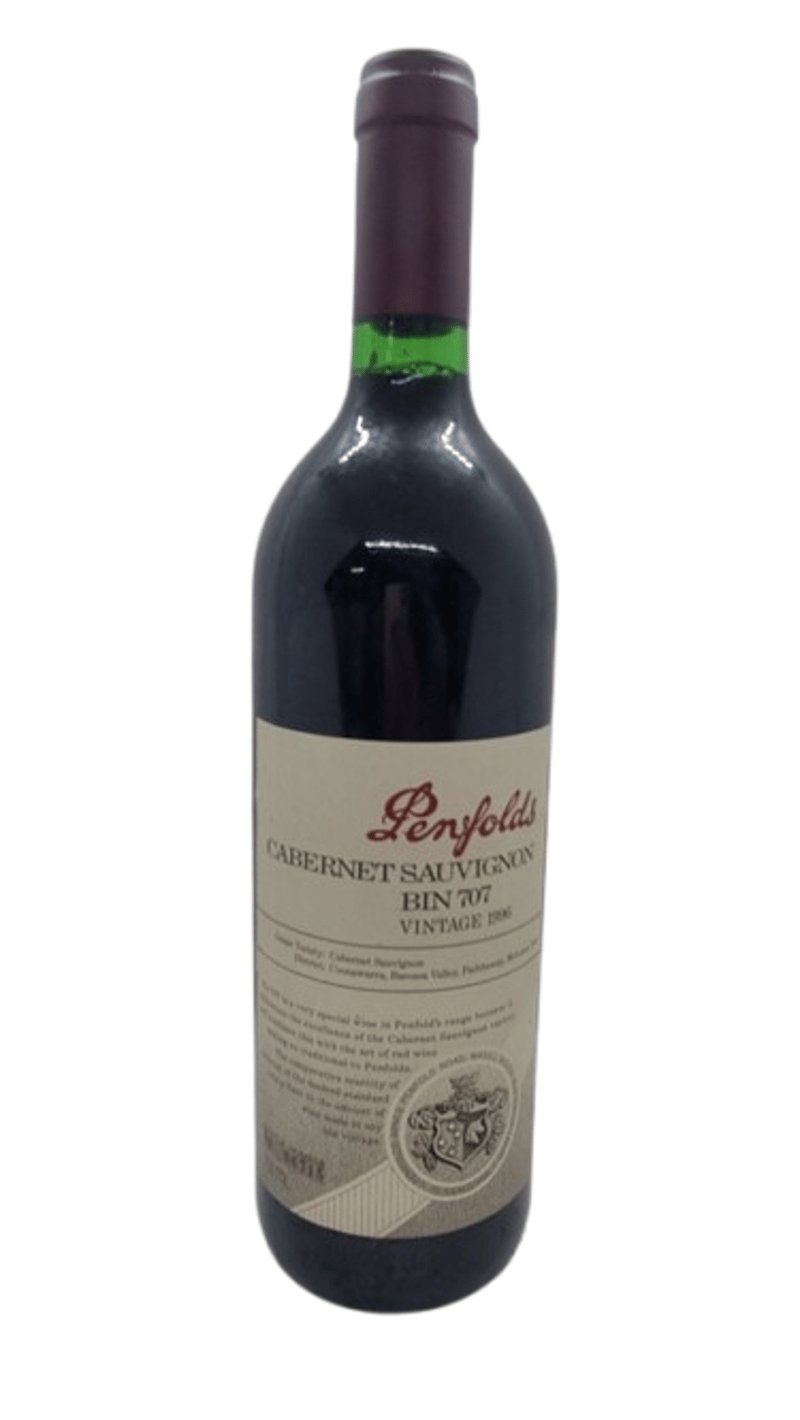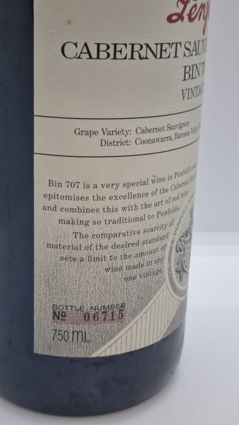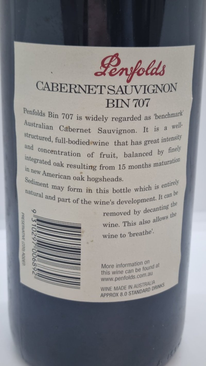 1996 Penfolds Cabernet Sauvignon Bin 707 Bottle no: 06715NOSE This brooding giant releases compelling barrel-ferment richness, enveloped by vibrant cassisfruit. Once allowed to breathe, complex berry andcassis Cabernet aromas emanate with abackground of cedary oak and violet nuances.PALATE Full bodied with dense layers of tight, saturatedCabernet fruit. A formidable concentration ofberried fruits, blackcurrant and anise combine tocreate a rich and expansive mid-palate. Stylishoak handling combined with a backbone of firm,yet finely grained tannins, support a lingeringfinish.