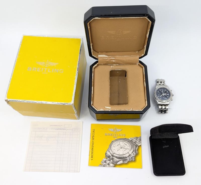 BREITLING BLACKBIRD CASE DESCRIPTION: STAINLESS STEEL CASE SIZE: 38MM BRACELET: STAINLESS STEEL MOVEMENT: AUTOMATIC BOX: INCLUDED PAPERS: NOT INCLUDED Condition: Good - Refer To Images Additional Information: Black Dial Non Numerical Hourmarkers Date Display At 3 O'Clock Position 3X Chronograph Fold Clasp Movement Untested VAULT 582880+2