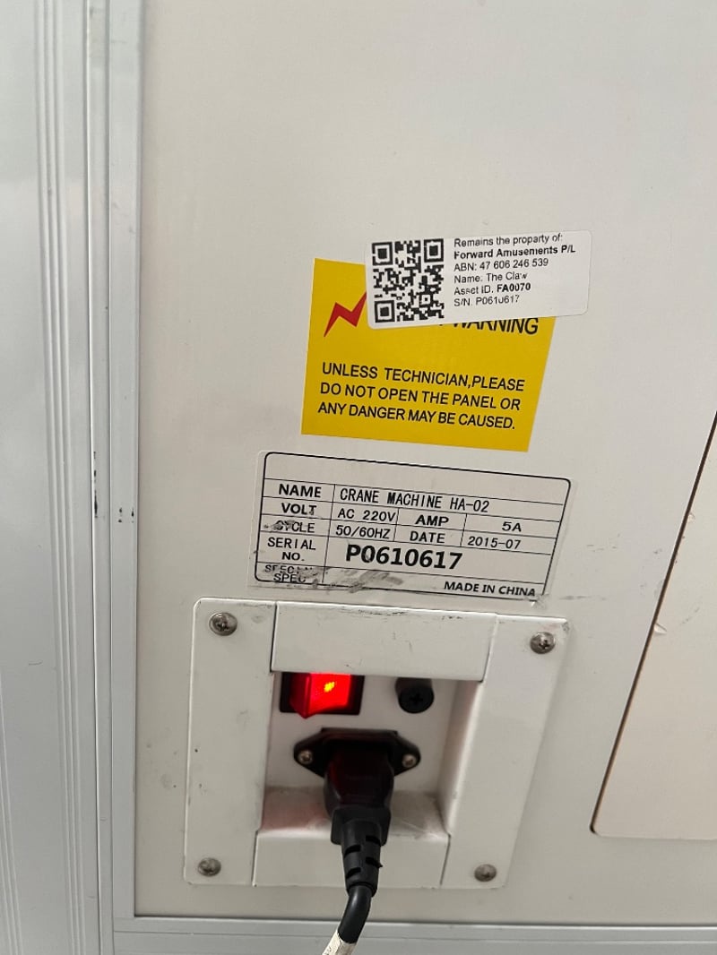 Redemption Arcade Machine, The Claw, model; crane machine HA-02, serial; P0610617, includes key, power cord, manual, not set to free play
