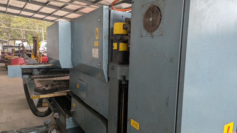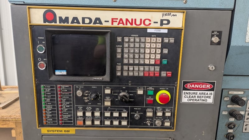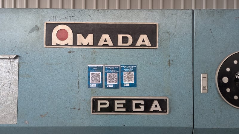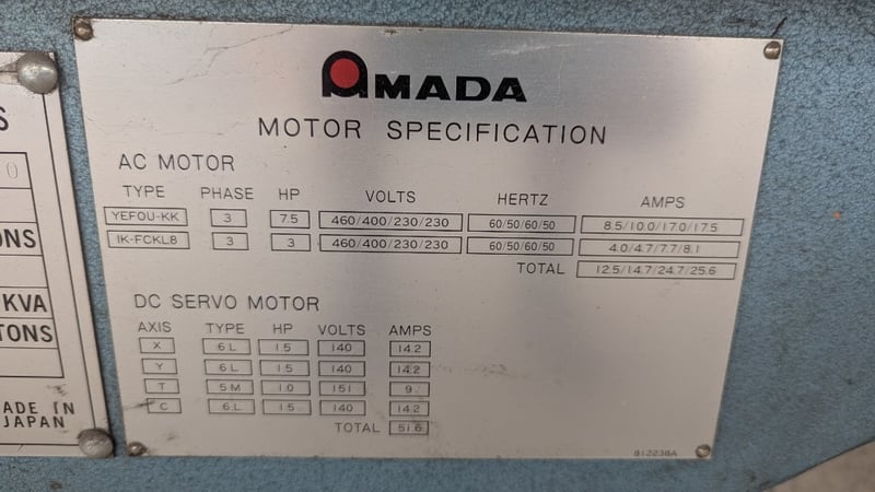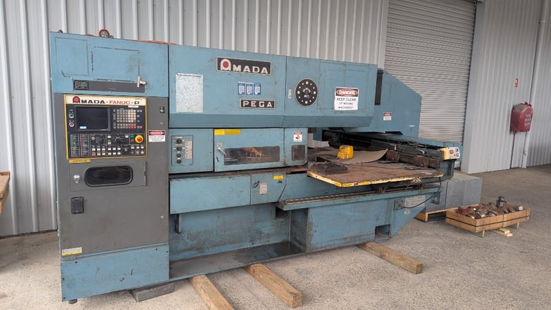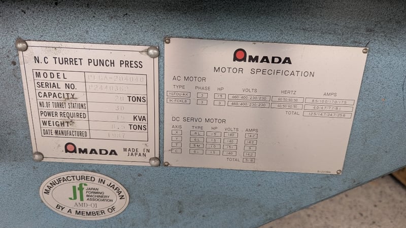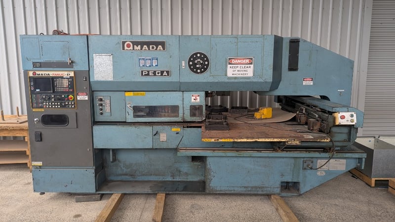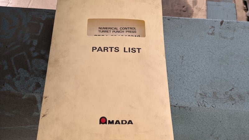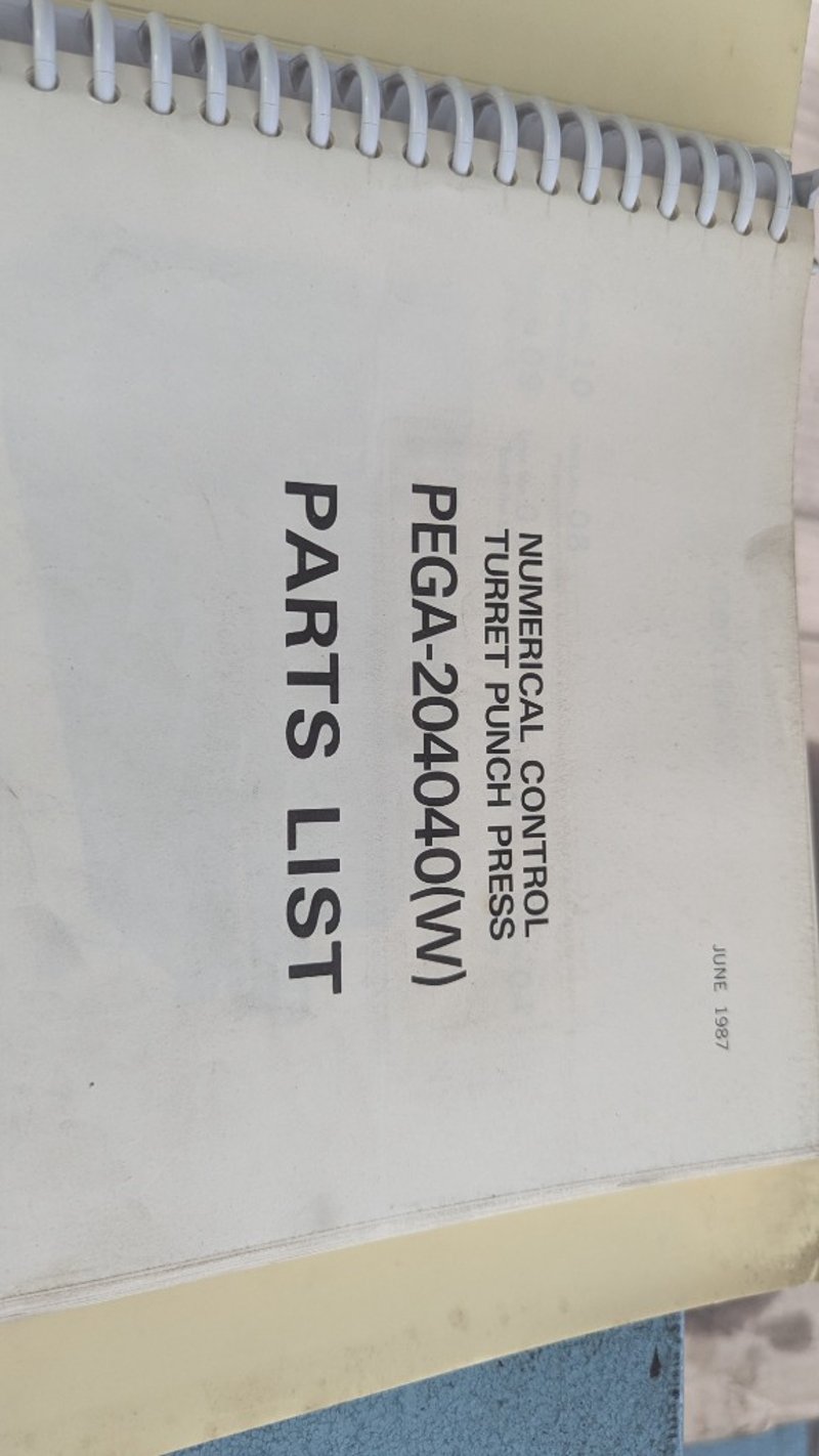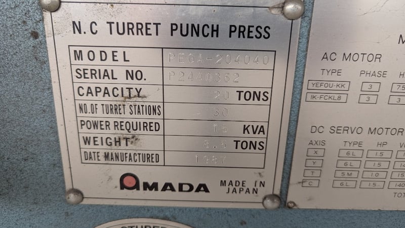 N.C Turret Punch Press, Amada, Model: PEGA - 204040, Serial No: P2440362, Capacity 20 Tons, No of Turret Stations 30, Power Required 15 KVA, 3 Phase Power, Date of Manufacture 1987, 2 × AC Motors, 4 × DC Servo Motors, Amada - Fanuc - P Control Panel, UOD MSA-C50T-P Hydraulic Motor, Includes Shock Absorbering Floor Plates, Assorted Hubs and Spare Parts, Weight 8.5 Ton, Dimensions 205cm(H)×400cm(W)×235cm(D)