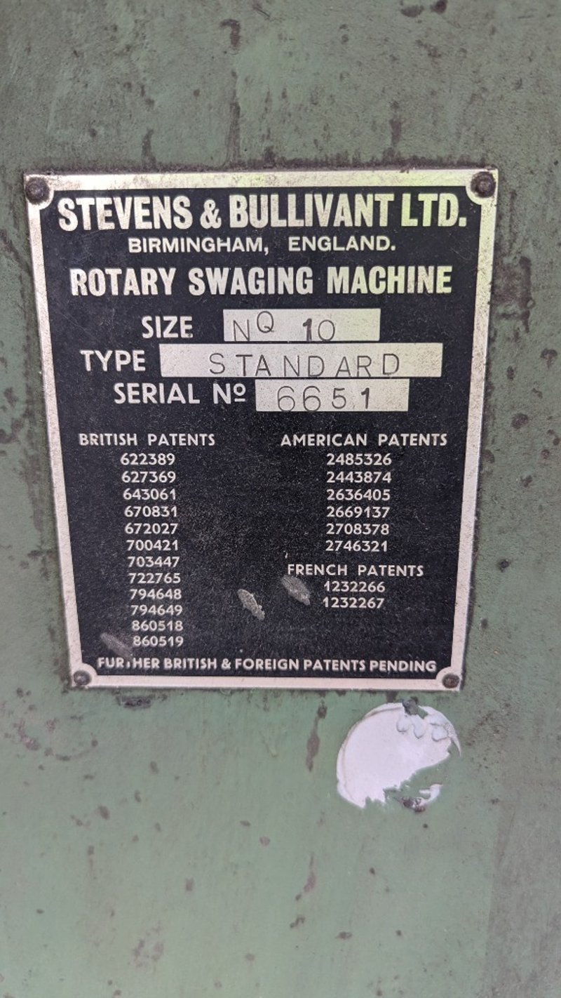 Rotary Swaging Machine, Stevens & Bullivant LTD, Size: NQ 10, Type: Standard, Serial No: 6651, 3 Phase Power, Fork Lifting Points, Dimensions 190cm(H)×93cm(W)×120cm(D)