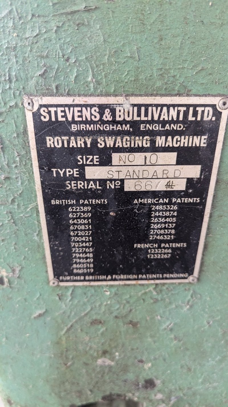 Rotary Swaging Machine, Stevens & Bullivant Ltd, Size: No 10, Type: Standard, Serial No: 6674, Foot Pedal Control, 3 Phase Power, Lifting Points, Includes Various Does, Dimensions 135cm(H)×80cm(W)×60cm(D)