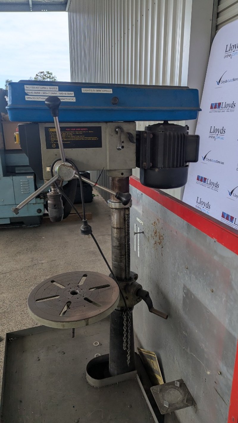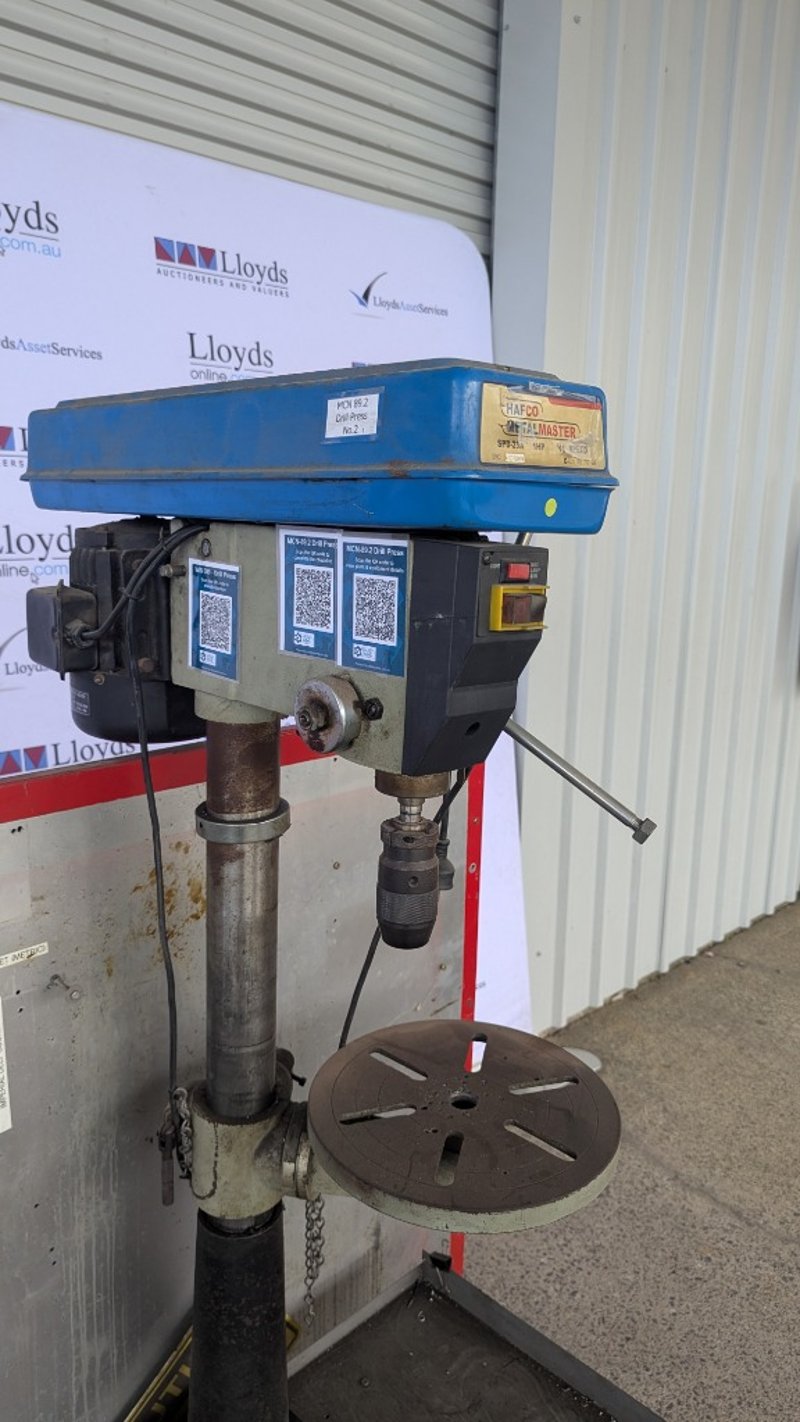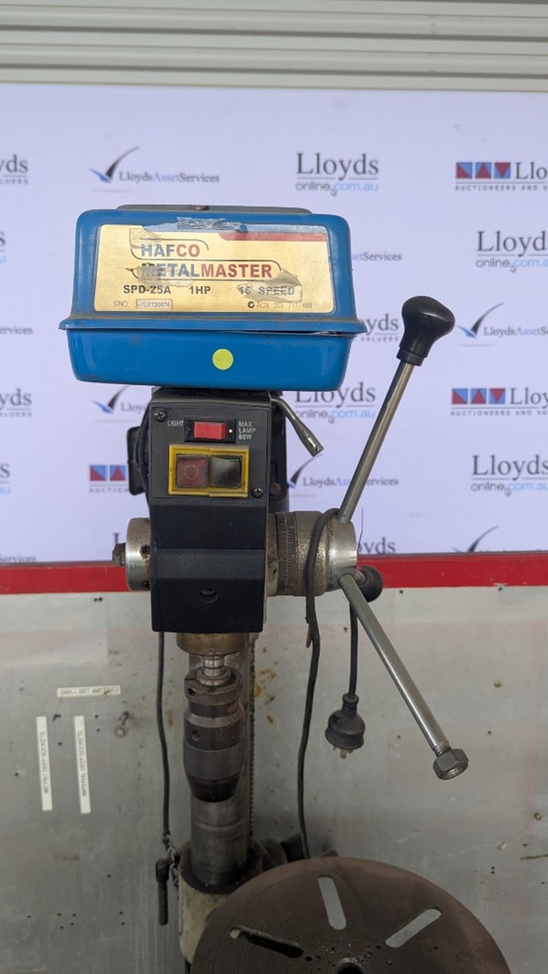 Drill Press, HafCo Metalmaster, Model: SPD-25A, 1 HP, 16 Speed, 240 V, On Stand with Metal Board, Dimensions 173cm(H)×111cm(W)×65cm(D)