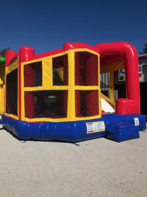 Jumping Castle, 5in1 combo Jumping Castle includes bounce area, slide, climbing wall, obstacles, and basketball hoop. (blower included)Note: General wear and tear has been previously repaired (patched). Approximately 5 years old. Has a hole in back netting. Size: 6m Length x 6.5 Width x 4.6m Height, With a slide platform height of 2.4m