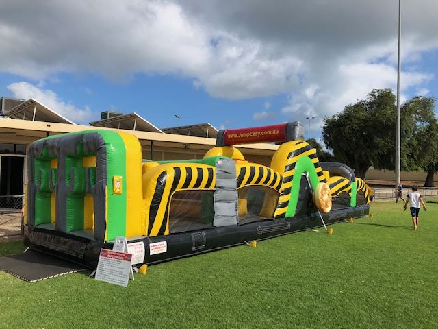 Jumping Castle, 'Nuclear Meltdown', This is an obstacle course that has a slide in the centre, Size: 13m Length x 3.5m Width x 3.4m Height, 1.8m Slide platform height.