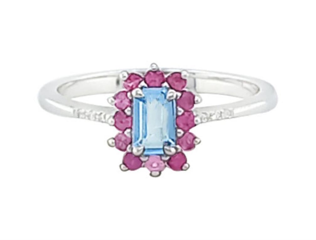 9CT WHITE GOLD AQUAMARINE SAPPHIRE AND DIAMODN RING