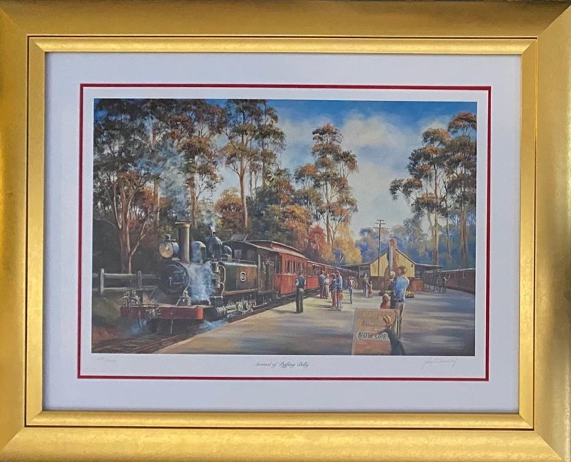JOHN BRADEY LIMITED EDITION PRINT - ARRIAVAL OF PUFFING BILLY Framed Using Double Mats, Glass And A Gold Frame Hand Signed By The Artist (John Bradely) Using A Pencil. Limited Edition Print - Number 419/500 Image 40.5Cm X 57Cm Condition - Refer To Image 160639+36