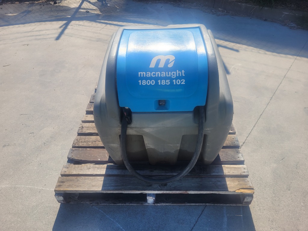 Description: Used Macnaught diesel fuel pod, with hose and pump handle, approximate dimensions L 850mm x W 700mm x H 760mm.