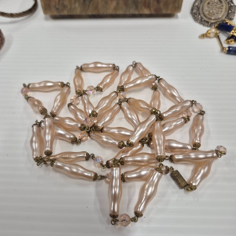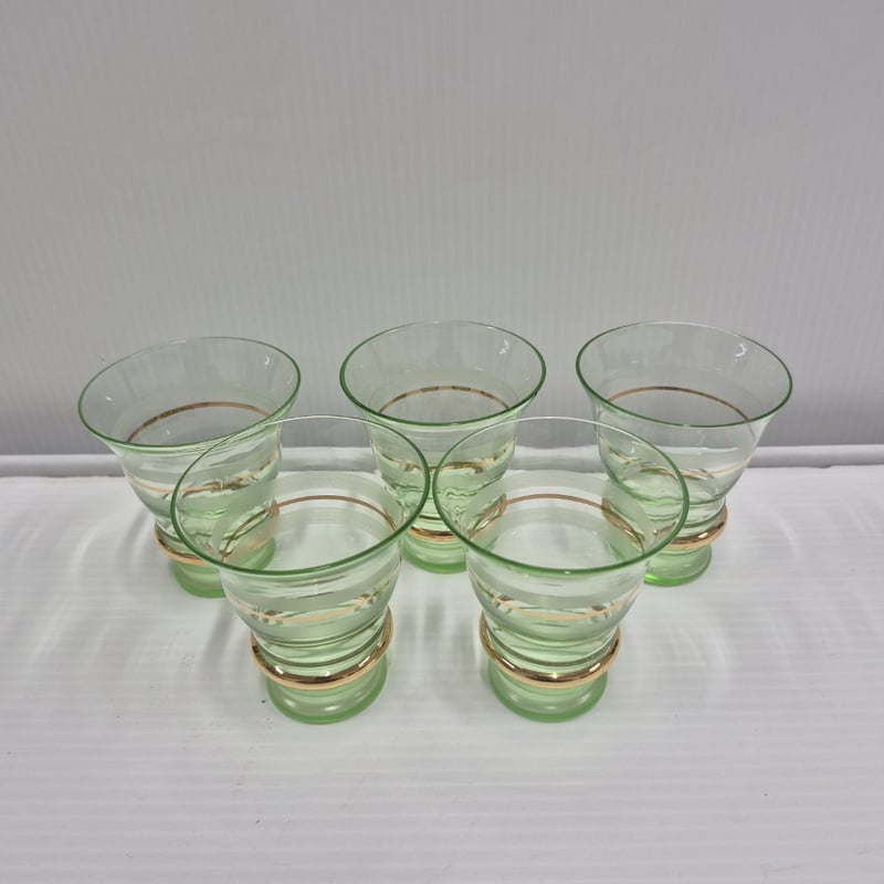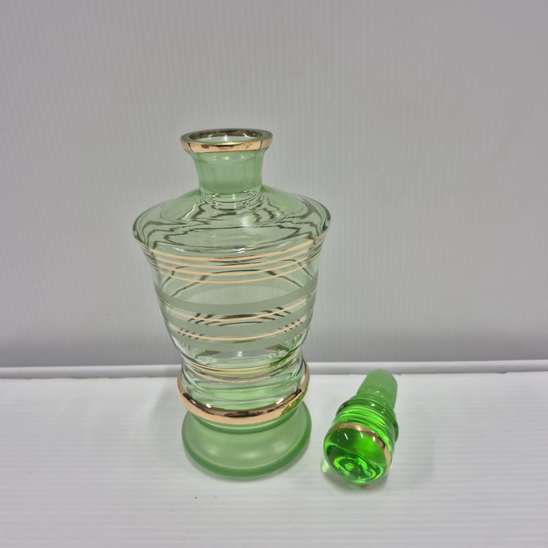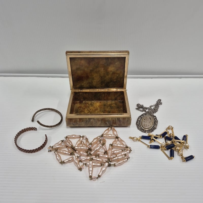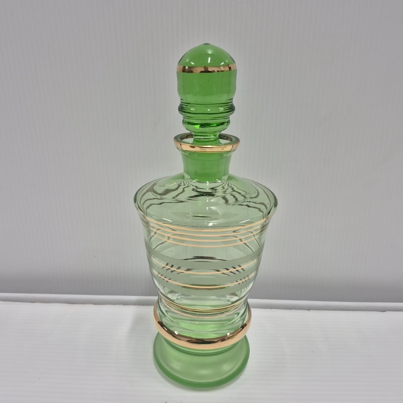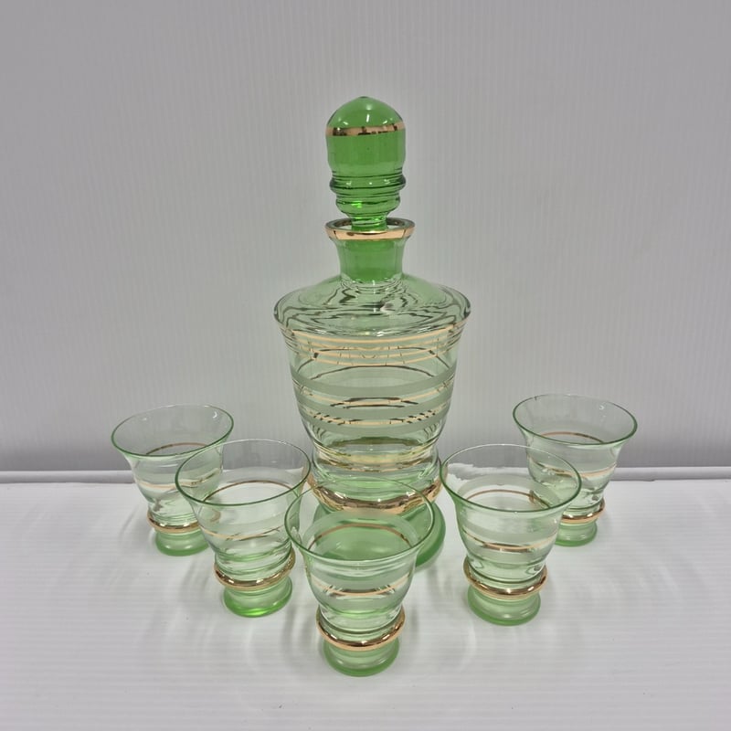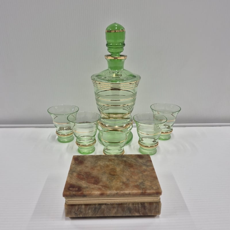 VINTAGE GLASS DECANTER WITH 5 GLASSES I GLASS HAS A CHIP AS IN PHOTOJEWELLERY BOX AND ASSORTED JEWELLERYCondition: Good - Refer To Images587674+2