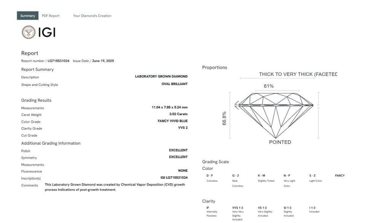 3.02 CARATS FANCY VIVID BLUE/VVS2 LAB GROWN DIAMOND - IGI CERTIFIED 3.02 Carats Fancy Vivid Blue/Vvs2 Lab Grown Diamond - Igi Certified Certificate Number - Lg715531024 Color/Clarity - Fancy Vivid Blue/Vvs2 Shape - Oval Dimension - 11.04 X 7.85 X 5.24 Mm Cut - N/A Symmetry - Excellent Fluorescence - None Polish - Excellent External Video Link - Https://Kn360.S3.Eu-North-1.Amazonaws.Com/715531024.Html 0 +231