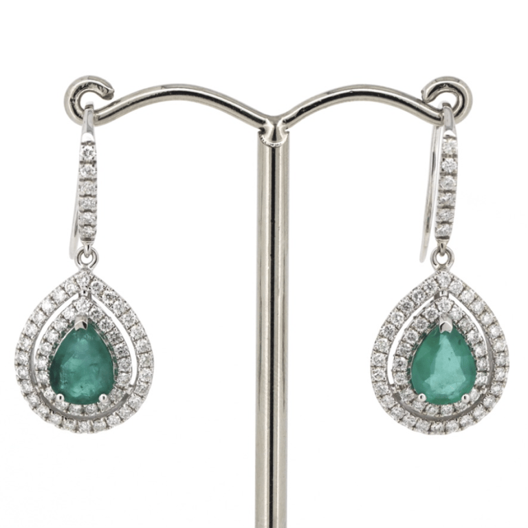 14K WHITE GOLD, 1.79CT ZAMBIAN EMERALD AND DIAMOND, DOUBLE HALO EARRINGS. The Centres Feature, 2 Pear Mixed Cut, Moderate Bluish-Green, Zambian Emeralds (1.79Ct Tsw, Moderately Included), 3 Claw Set. Surrounding The Centres In Double Halos Are, 106 Round Brilliant Cut, Diamonds (1.00Ct Tdw, G-H Colour, Si1-Si2 Clarity), Claw Set. The Earrings Feature Shepherd Hooks. Jewellery Valuations Provided By A Third Party Professional Not Directly Associated With Lloyds Auctions at AUD $$20,000.00This Insurance Valuation has been provided by a registered Jewellery Valuer and is intended for insurance purposes only. The valuation amount has no bearing on the auction value of the item. Any questions regarding the valuation should be directed to the issuing Valuer (refer to contact details on the certificate) as Lloyds have no association or relationship with the Valuer or the valuation amount contained within the valuation. Condition: Good - Refer to Images 0645819+5007Crossdock