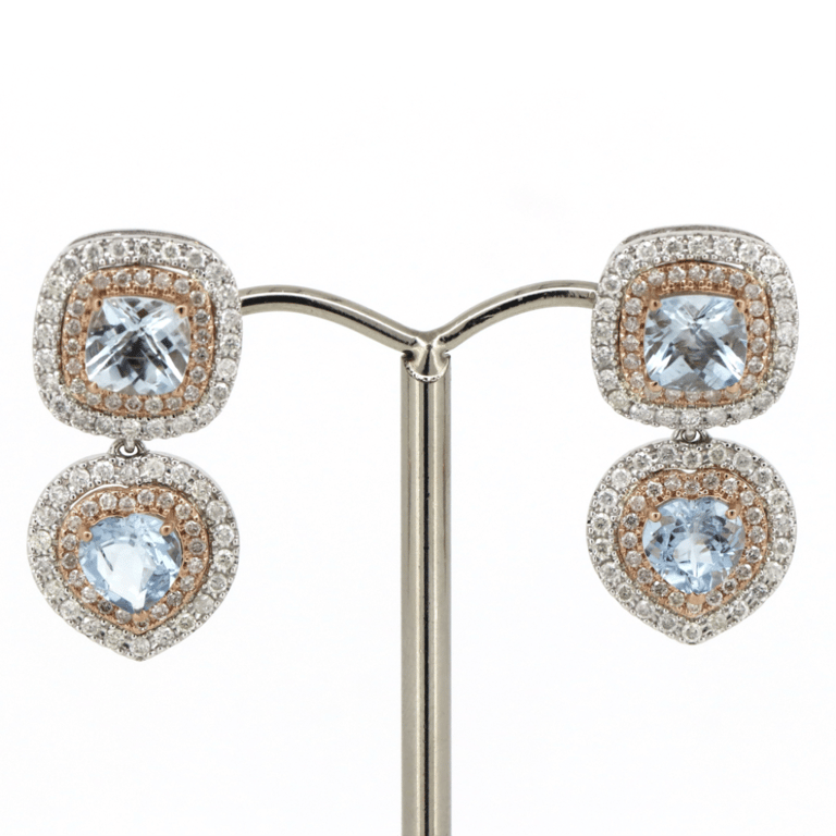 14K ROSE/WHITE GOLD, AQUAMARINE AND DIAMOND, DOUBLE DROP HALO EARRINGS. The Centres Feature, 4 Cushion Checkerboard And Heart Cut, Light Blue, Aquamarines (2.97Ct Tsw, Moderate Natural Inclusions), Carved Claw Set. Surrounding The Centre In Double Halos Are, 176 Round Brilliant Cut, Diamonds (1.25Ct Tdw, H-J Colour, Si-I1 Clarity), 4 Claw Set. The Earrings Feature Butterfly Clasps Set In 14K White Gold. Jewellery Valuations Provided By A Third Party Professional Not Directly Associated With Lloyds Auctions at AUD $$16,500.00This Insurance Valuation has been provided by a registered Jewellery Valuer and is intended for insurance purposes only. The valuation amount has no bearing on the auction value of the item. Any questions regarding the valuation should be directed to the issuing Valuer (refer to contact details on the certificate) as Lloyds have no association or relationship with the Valuer or the valuation amount contained within the valuation. Condition: Good - Refer to Images 0645819+5092Crossdock