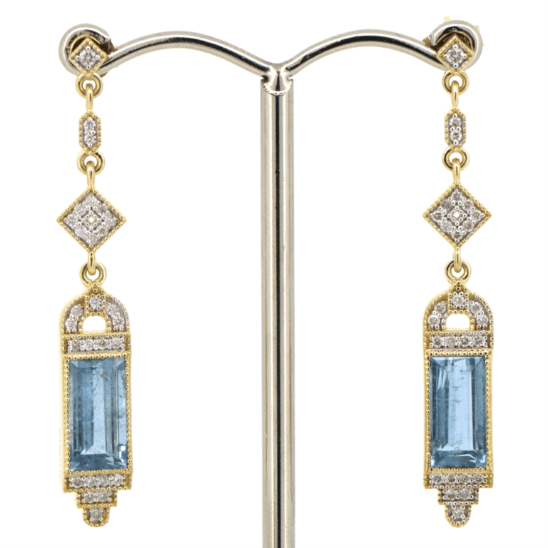 14K YELLOW GOLD, AQUAMARINE AND DIAMOND, DROP EARRINGS. The Centres Feature, 2 Rectangle Cut, Strong Moderate Blue, Aquamarines (3.76Ct Tsw, Slightly Included), Bezel Set. Encompassing The Centres Are, 54 Round Brilliant Cut, Diamonds (0.32Ct Tdw, G-H Colour, Si1-Si2 Clarity), Bead Set. The Earrings Feature Butterfly Post Backs. Jewellery Valuations Provided By A Third Party Professional Not Directly Associated With Lloyds Auctions at AUD $$22,000.00This Insurance Valuation has been provided by a registered Jewellery Valuer and is intended for insurance purposes only. The valuation amount has no bearing on the auction value of the item. Any questions regarding the valuation should be directed to the issuing Valuer (refer to contact details on the certificate) as Lloyds have no association or relationship with the Valuer or the valuation amount contained within the valuation. Condition: Good - Refer to Images 0645819+5059Crossdock