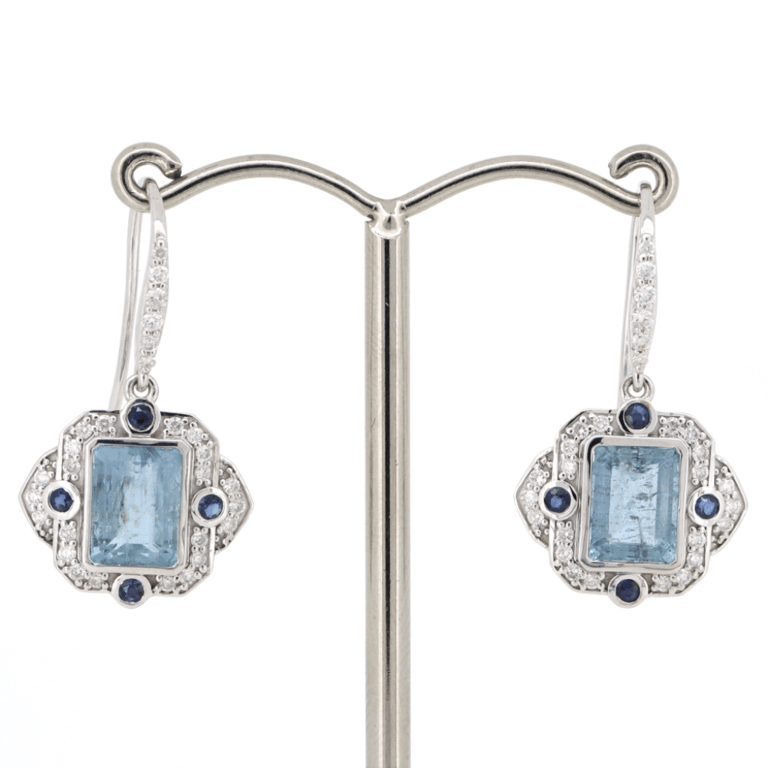 14K WHITE GOLD, AQUAMARINE, BLUE SAPPHIRE AND DIAMOND, ART DECO INSPIRED DROP EARRINGS. The Centres Feature, 2 Emerald Cut, Medium Blue, Aquamarines (3.24Ct Tsw, Light Natural Inclusions), Bezel Set. Decorating The Centres Are, 8 Round Faceted Cut, Medium-Dark Blue, Sapphires (0.26Ct Tsw, Eye Clean Clarity), Bezel Set. Encompassing The Design Are, 56 Round Brilliant Cut, Diamonds (0.42Ct Tdw, H-J Colour, Si-I2 Clarity), Bead Set. The Earrings Feature Shepherd Hooks. Jewellery Valuations Provided By A Third Party Professional Not Directly Associated With Lloyds Auctions at AUD $$18,500.00This Insurance Valuation has been provided by a registered Jewellery Valuer and is intended for insurance purposes only. The valuation amount has no bearing on the auction value of the item. Any questions regarding the valuation should be directed to the issuing Valuer (refer to contact details on the certificate) as Lloyds have no association or relationship with the Valuer or the valuation amount contained within the valuation. Condition: Good - Refer to Images 0645819+5057Crossdock