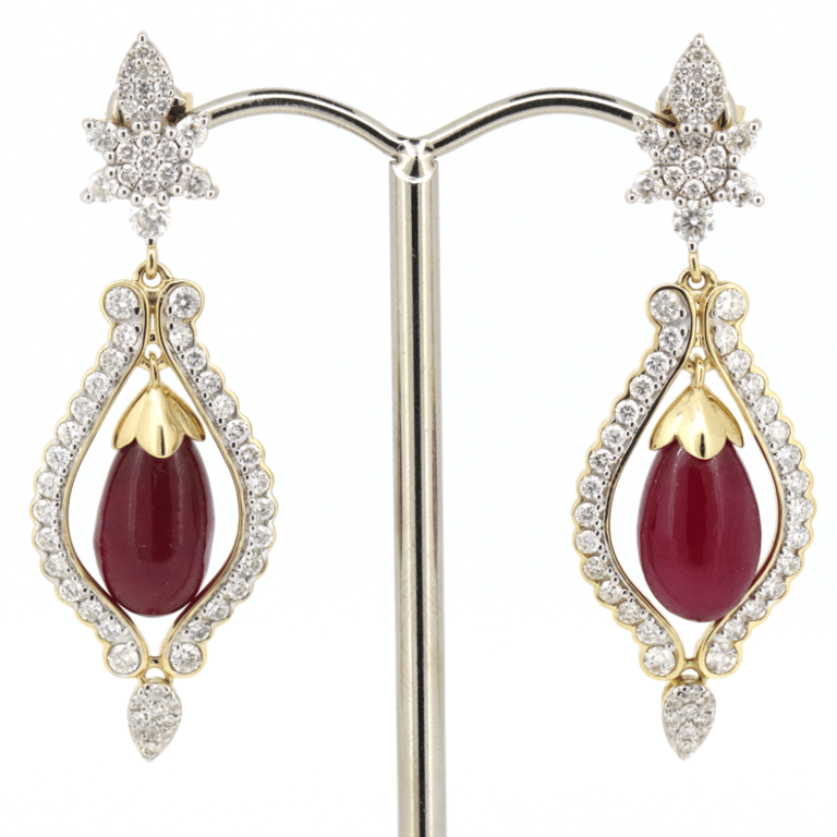 14K YELLOW GOLD, RUBY AND DIAMOND, DROP EARRINGS. The Centres Feature, 2 Cabochon Cut, Deep Moderate Red, Rubies (14.30Ct Tsw, Slightly Included), Pin Capped Setting. Decorating The Bail And The Hooks Are, 120 Round Brilliant Cut, Diamonds (1.57Ct Tdw, G-H Colour, Si1-Si2 Clarity), Claw/Bead Set. Jewellery Valuations Provided By A Third Party Professional Not Directly Associated With Lloyds Auctions at AUD $$28,000.00This Insurance Valuation has been provided by a registered Jewellery Valuer and is intended for insurance purposes only. The valuation amount has no bearing on the auction value of the item. Any questions regarding the valuation should be directed to the issuing Valuer (refer to contact details on the certificate) as Lloyds have no association or relationship with the Valuer or the valuation amount contained within the valuation. Condition: Good - Refer to Images 0645819+5012Crossdock
