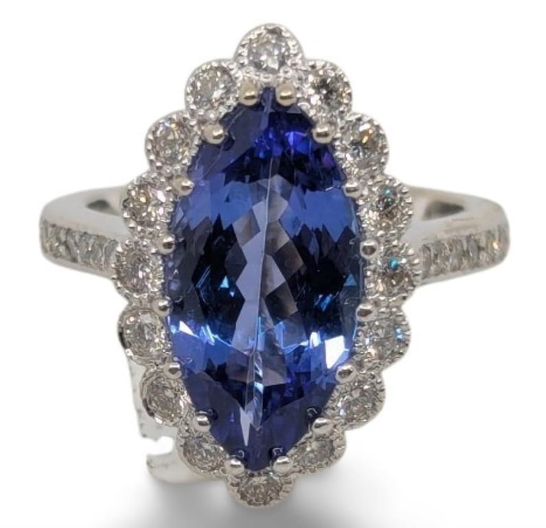 14CT WHITE GOLD TANZANITE AND DIAMOND RING Total Item Weight: 6.4gms Featuring One 4.09Ct Marquise Cut Bluish Violet Tanzanite Surrounded By Thirty 0.68Tcw Round Brilliant Cut Diamonds, Colour: G-H, Clarity: Si1-Si2 Markings: 14K Jewellery Valuations Provided By A Third Party Professional Not Directly Associated With Lloyds Auctions at AUD $20670This Insurance Valuation has been provided by a registered Jewellery Valuer and is intended for insurance purposes only. The valuation amount has no bearing on the auction value of the item. Any questions regarding the valuation should be directed to the issuing Valuer (refer to contact details on the certificate) as Lloyds have no association or relationship with the Valuer or the valuation amount contained within the valuation. Condition: Good - Refer Images Please Note: Valuation Certificate Is In Usd.586043+4