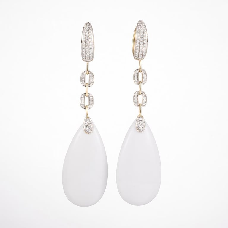 14CT YELLOW GOLD WHITE ONYX AND DIAMOND VINTAGE STYLE DROP EARRINGS. Featuring Centre, 2 Polished Pear Cut, White Onyx (42.48Ct Tsw, Opaque), Drill Set, With 124 Round Brilliant Cut Diamonds (0.50Ct Tdw, G-H Colour, Si1-Si2 Clarity), Bead Set. Valuations Provided by an Independent Third-Party Professional Not Directly Associated With Lloyds Auctions at AUD $19160This valuation has been conducted by an independent third-party professional. The valuation amount is an assessment by the issuing valuer and does not reflect the auction value of the item. Any inquiries regarding the valuation should be directed to the issuing valuer (refer to contact details on the certificate), as Lloyds Auctions has no affiliation or influence over the valuation, the valuer, or the stated amount. Condition: Good - Refer Images 0586122+362