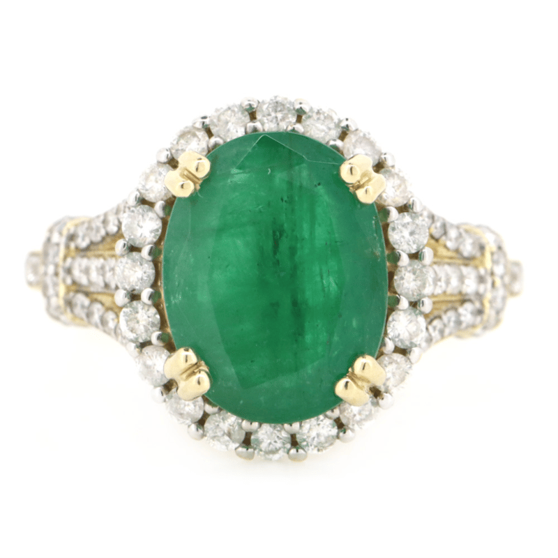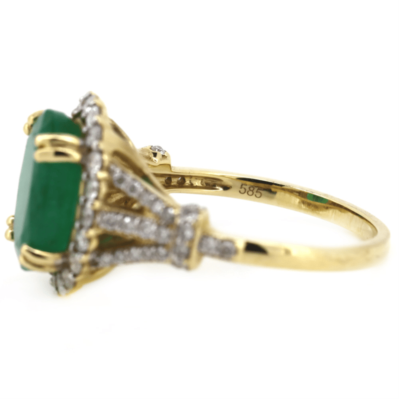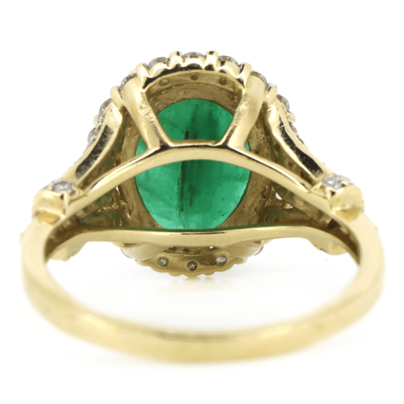 14K Yellow Gold, Emerald And Diamond, Halo Ring. The Centre Features, One Oval Cut, Dark Green, Emerald (4.20Ct, Moderate Natural Inclusions), Double 4 Claw Set. Surrounding The Centre In A Halo And Decorating The Setting Are, 64 Round Brilliant Cut, Diamonds (0.71Ct Tdw, H Colour, Si-P2 Clarity), Ring Size Q.