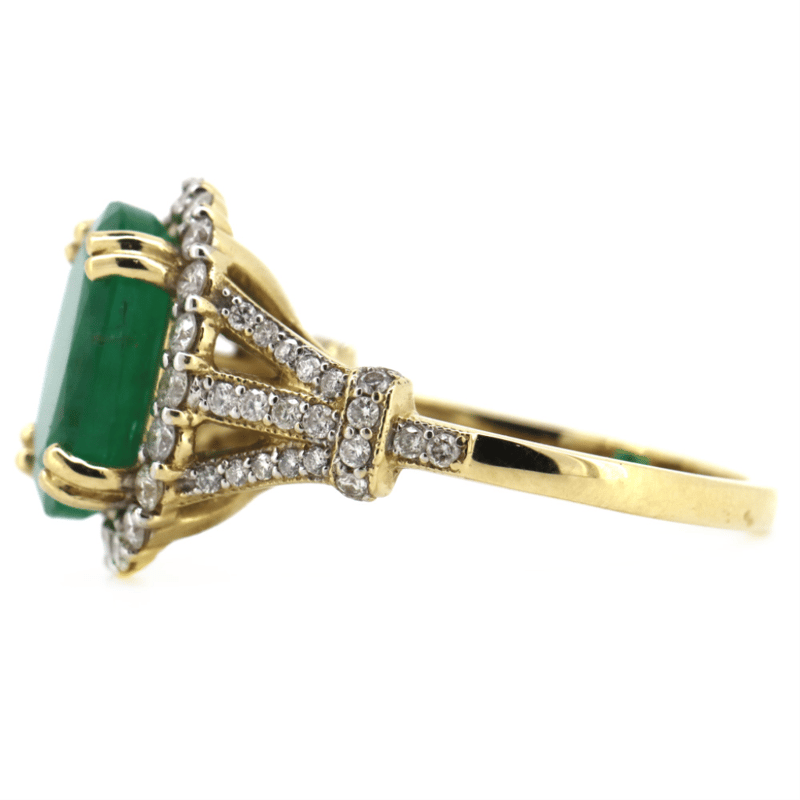 14K YELLOW GOLD, EMERALD AND DIAMOND, HALO RING.