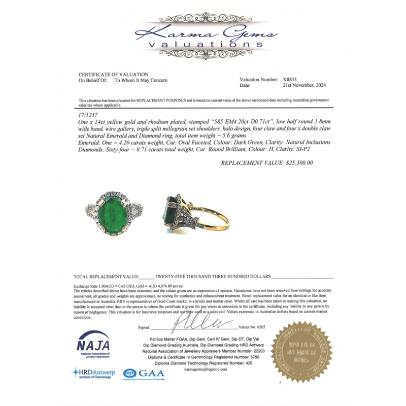 The Centre Features, One Oval Cut, Dark Green, Emerald (4.20Ct, Moderate Natural Inclusions), Double 4 Claw Set. Surrounding The Centre In A Halo And Decorating The Setting Are, 64 Round Brilliant Cut, Diamonds (0.71Ct Tdw, H Colour, Si-P2 Clarity), Ring Size Q.