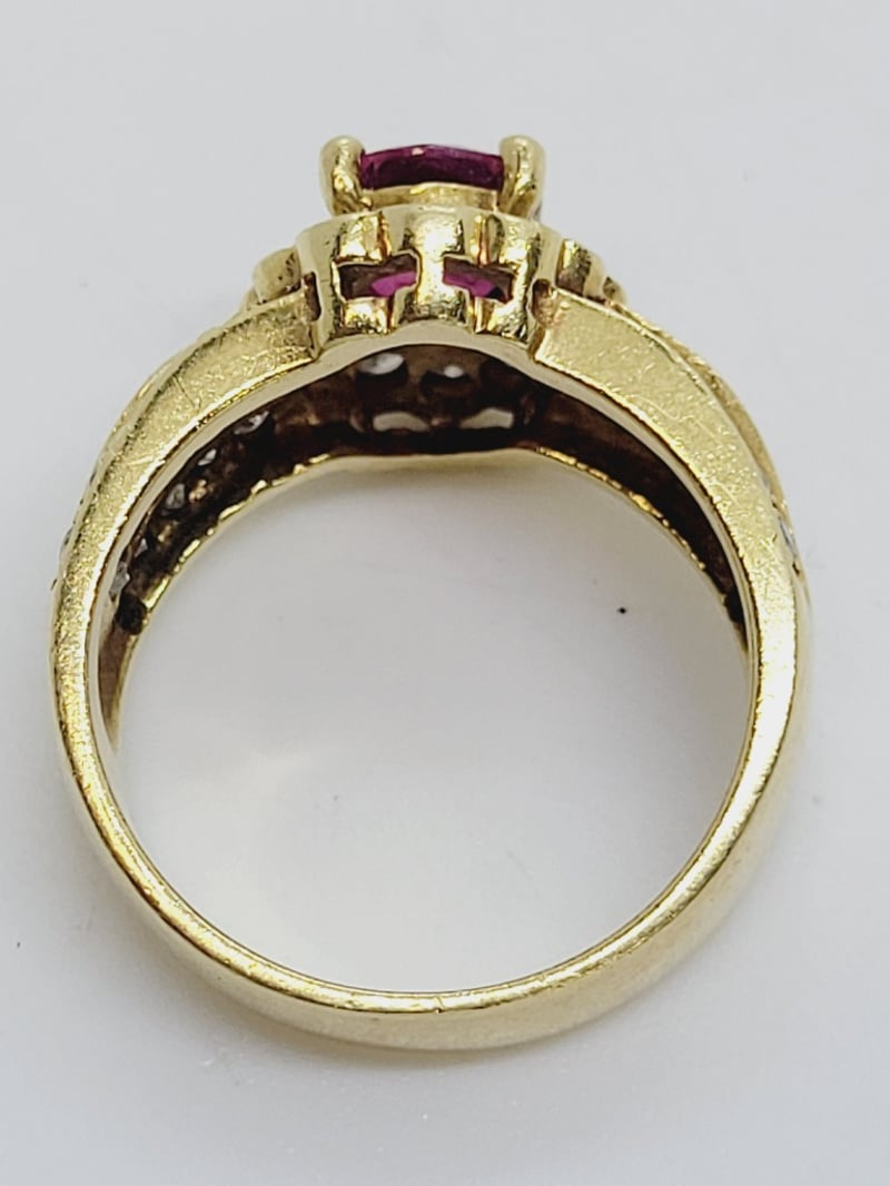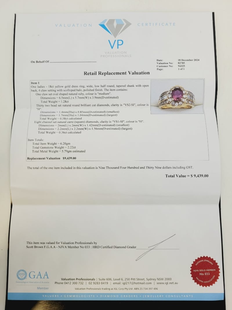 18CT YELLOW GOLD RUBY AND DIAMOND RINGItem Totals - Total Item Weight: 6.20GTotal Gemstone Weight:2.22CtTotal Metal Weight: 5.79GCondition: Excellent - Refer To ImagesProvenance: 18Ct Yellow Gold Dress Ring, Wide, Low Half Round, Tapered Shank With Open Back, 4 Claw Setting With Scolloped Halo , Polished FinishThis valuation has been conducted by an independent third-party professional. The valuation amount is an assessment by the issuing valuer and does not reflect the auction value of the item.Any inquiries regarding the valuation should be directed to the issuing valuer (refer to contact details on the certificate), as Lloyds Auctions has no affiliation or influence over the valuation, the valuer, or the stated amount.Insurance Replacement Valuation Amount: $9,439.00160466+36