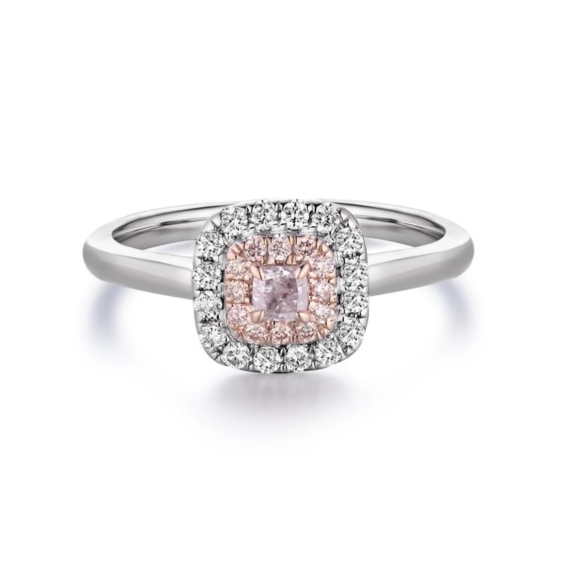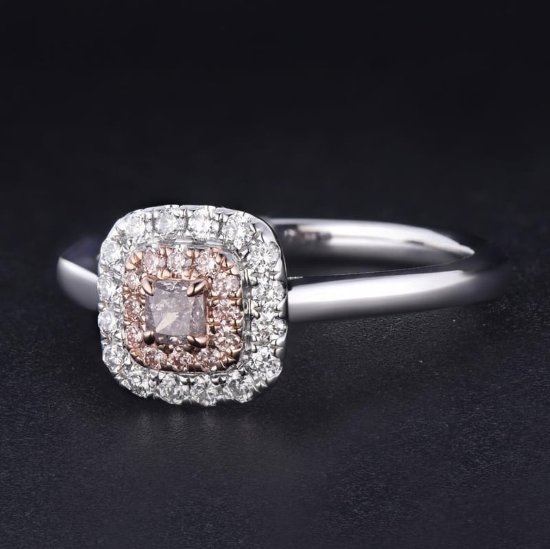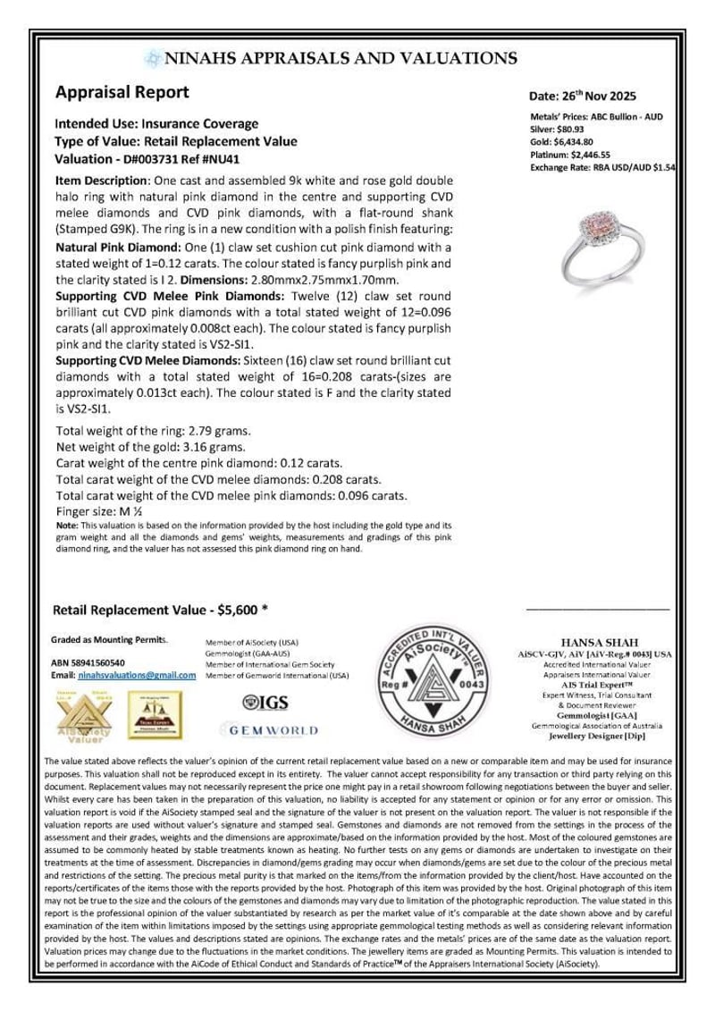 0.42TCW PINK DIAMOND GOLD RING One Cast And Assembled 9K White And Rose Gold Double Halo Ring With Natural Pink Diamond In The Centre And Supporting Cvd Melee Diamonds And Cvd Pink Diamonds, With A Flat-Round Shank (Stamped G9K). The Ring Is In A New Condition With A Polish Finish Featuring: Natural Pink Diamond: One (1) Claw Set Cushion Cut Pink Diamond With A Stated Weight Of 1=0.12 Carats. The Colour Stated Is Fancy Purplish Pink And The Clarity Stated Is I 2. Dimensions: 2.80Mmx2.75Mmx1.70Mm. Supporting Cvd Melee Pink Diamonds: Twelve (12) Claw Set Round Brilliant Cut Cvd Pink Diamonds With A Total Stated Weight Of 12=0.096 Carats (All Approximately 0.008Ct Each). The Colour Stated Is Fancy Purplish Pink And The Clarity Stated Is Vs2-Si1. Supporting Cvd Melee Diamonds: Sixteen (16) Claw Set Round Brilliant Cut Diamonds With A Total Stated Weight Of 16=0.208 Carats-(Sizes Are Approximately 0.013Ct Each). The Colour Stated Is F And The Clarity Stated Is Vs2-Si1. Total Weight Of The Ring: 2.79 Grams. Net Weight Of The Gold: 3.16 Grams. Carat Weight Of The Centre Pink Diamond: 0.12 Carats. Total Carat Weight Of The Cvd Melee Diamonds: 0.208 Carats. Total Carat Weight Of The Cvd Melee Pink Diamonds: 0.096 Carats. Finger Size: M ½ //Nu41// Valuations Provided by an Independent Third-Party Professional Not Directly Associated With Lloyds Auctions at AUD $5600 This valuation has been conducted by an independent third-party professional. The valuation amount is an assessment by the issuing valuer and does not reflect the auction value of the item. Any inquiries regarding the valuation should be directed to the issuing valuer (refer to contact details on the certificate), as Lloyds Auctions has no affiliation or influence over the valuation, the valuer, or the stated amount. Condition: Good - Refer Images 0 488844+1
