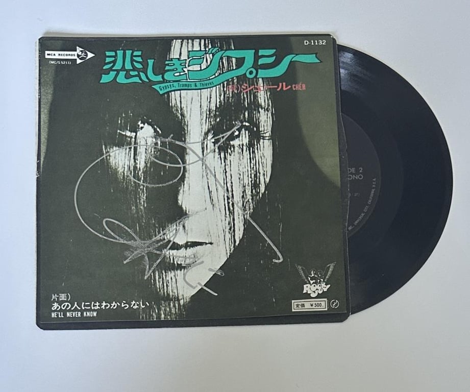 CHER SIGNED 45 GYPSIES TRAMPS RECORD COVER Cher Personally Signed 45 Gypsies Tramps Record Cover. Cher Is An American Singer And Actress. Dubbed The "Goddess Of Pop", She Is Known For Her Androgynous Contralto Voice, Bold Fashion And Visual Presentation, And Multifaceted Career. The Item Is Accompanied By A Certificate Of Authenticity. Condition: Good - Refer To Images 584906+33