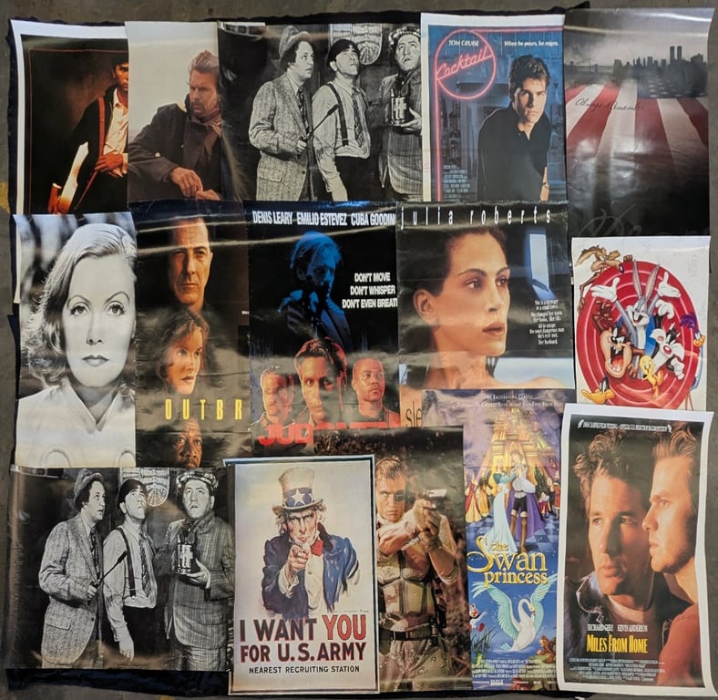 FIFTEEN POSTERS AND MOVIE POSTERS Poster Include: 'La Bamba', 'Dances With Wolves', 'Three Stooges', Greta Garbo Poster, 'Outbreak', 'Judgment Night', 'Sleeping With The Enemy', 'The Swan Princess', 'Universal Soldier', Uncle Sam Poster, 'Always Remember September 11' Poster, 'Looney Tunes', 'Miles From Home' Poster Lengths Range From Approx: 80-100Cm Some Posters Have Tears And Wear 584886+2