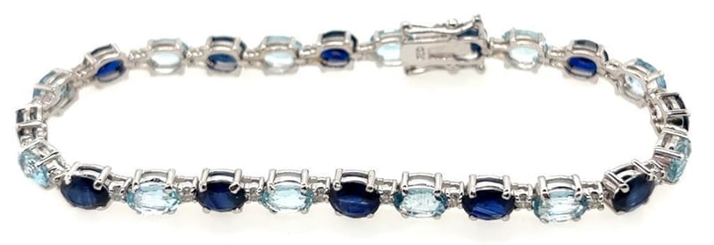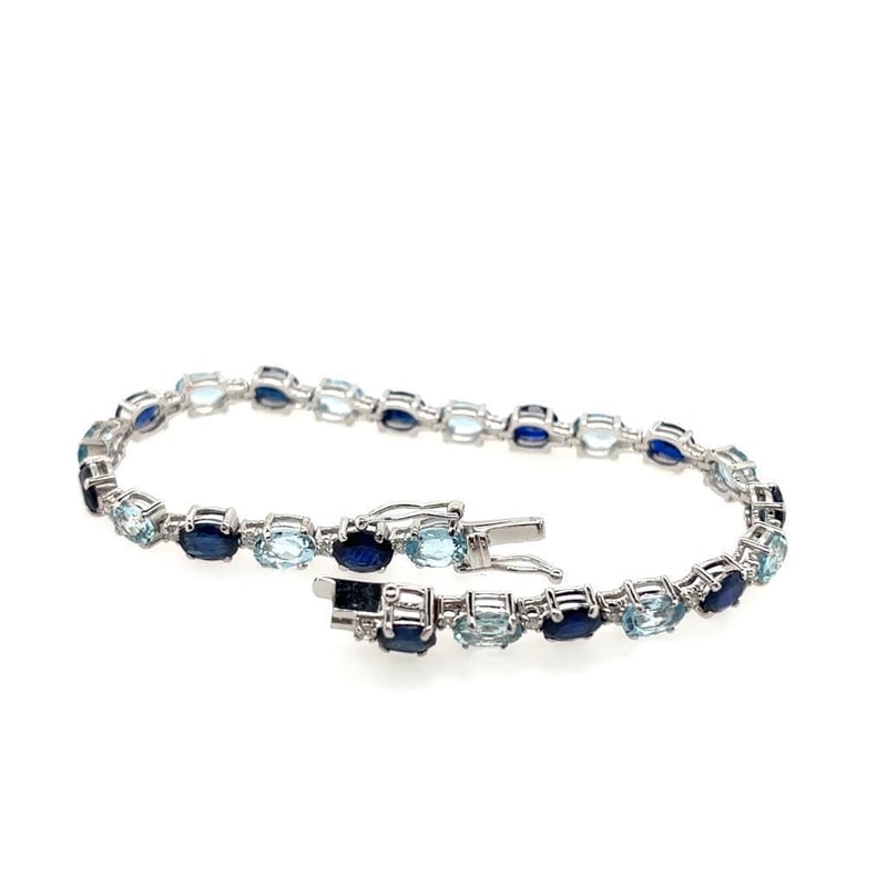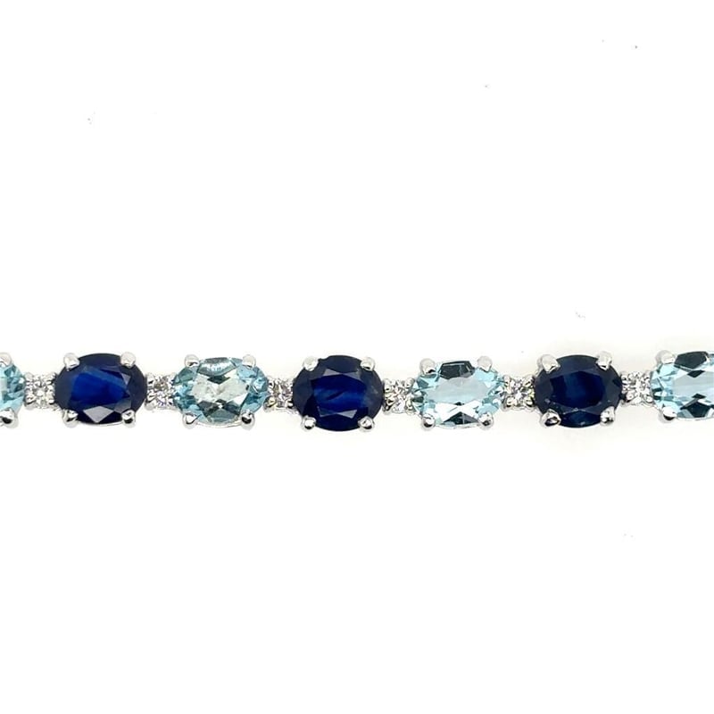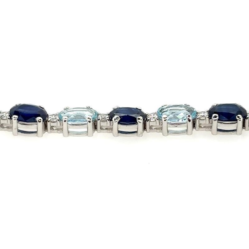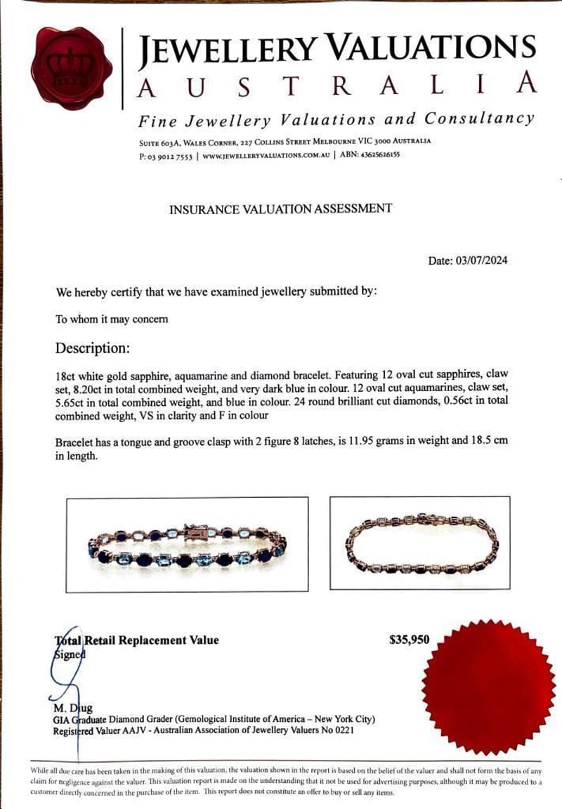 18CT WHITE GOLD SAPPHIRE, AQUAMARINE AND DIAMOND BRACELET Total Item Weight: 11.95gms Size: 18.5cms This 18Ct White Gold Bracelet With A Tongue And Groove Clasp And Figure Eight Latches Features 12 X Oval Cut Claw Set Sapphires, 8.20Ct In Total Combined Weight And Very Dark Blue In Colour, 12 X Oval Cut Claw Aquamarines, 5.65Ct In Total Combined Weight And Blue In Colour With 24 X Round Brilliant Cut Diamonds, 0.56Ct In Total Combined Weight, Vs In Clarity And F In Colour. Jewellery Valuations Provided By A Third Party Professional Not Directly Associated With Lloyds Auctions at AUD $35950This Insurance Valuation has been provided by a registered Jewellery Valuer and is intended for insurance purposes only. The valuation amount has no bearing on the auction value of the item. Any questions regarding the valuation should be directed to the issuing Valuer (refer to contact details on the certificate) as Lloyds have no association or relationship with the Valuer or the valuation amount contained within the valuation. Condition: Excellent- Refer Images 0162901+174CROSSDOCK