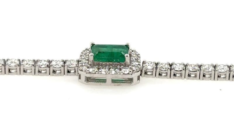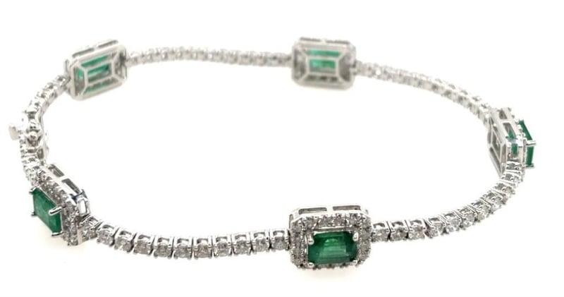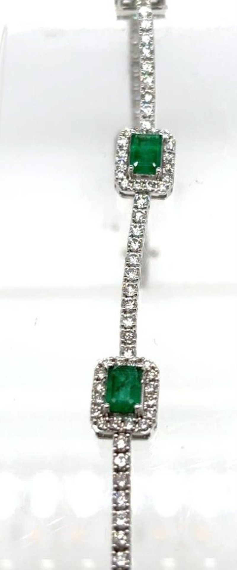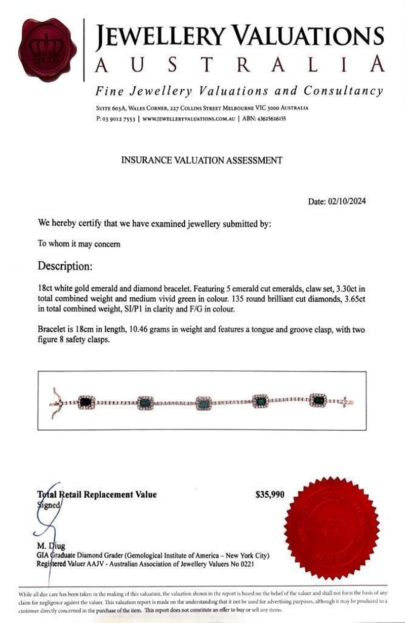 18CT WHITE GOLD EMERALD AND DIAMOND BRACELET Total Item Weight: 10.46gms Size: 18cms Featuring 5 Emerald Cut Emeralds, Claw Set, 3.30Ct In Total Combined Weight And Medium Vivid Green In Colour. 135 Round Brilliant Cut Diamonds, 3.65Ct In Total Combined Weight, Si/P1 In Clarity And F/G In Colour. Features A Tongue And Groove Clasp, With Two Figure 8 Safety Clasps. Jewellery Valuations Provided By A Third Party Professional Not Directly Associated With Lloyds Auctions at AUD $35990This Insurance Valuation has been provided by a registered Jewellery Valuer and is intended for insurance purposes only. The valuation amount has no bearing on the auction value of the item. Any questions regarding the valuation should be directed to the issuing Valuer (refer to contact details on the certificate) as Lloyds have no association or relationship with the Valuer or the valuation amount contained within the valuation. Condition: Excellent- Refer Images 0162901+207CROSSDOCK