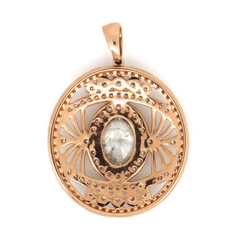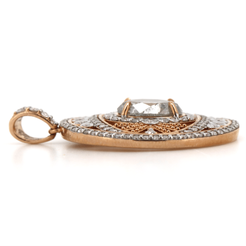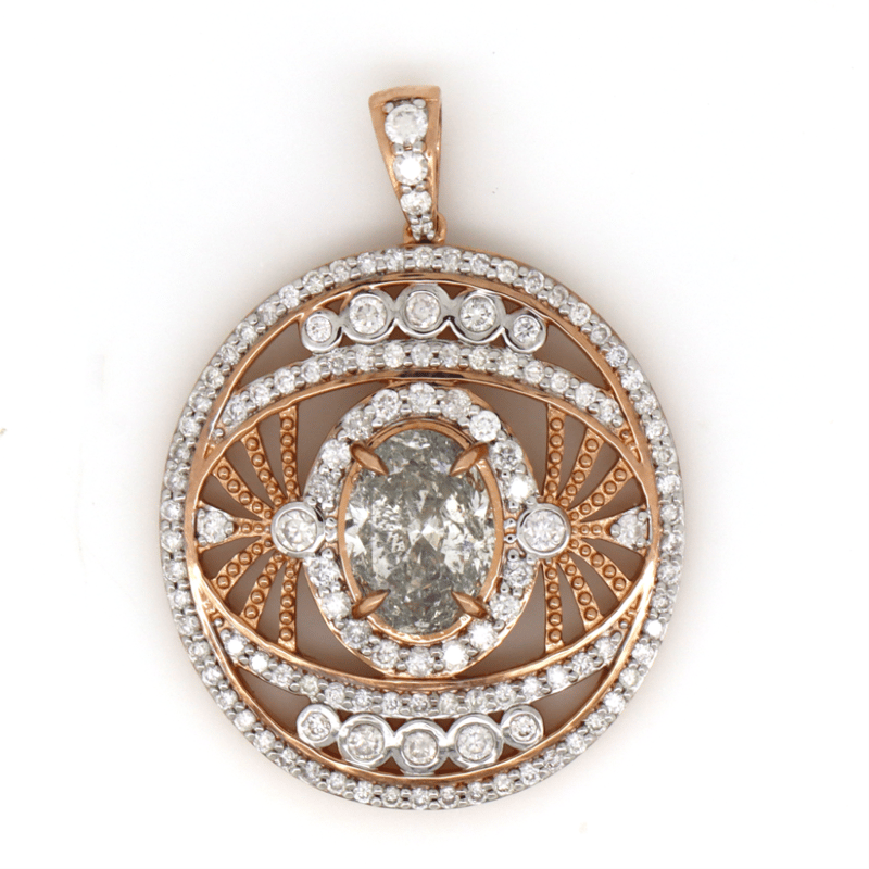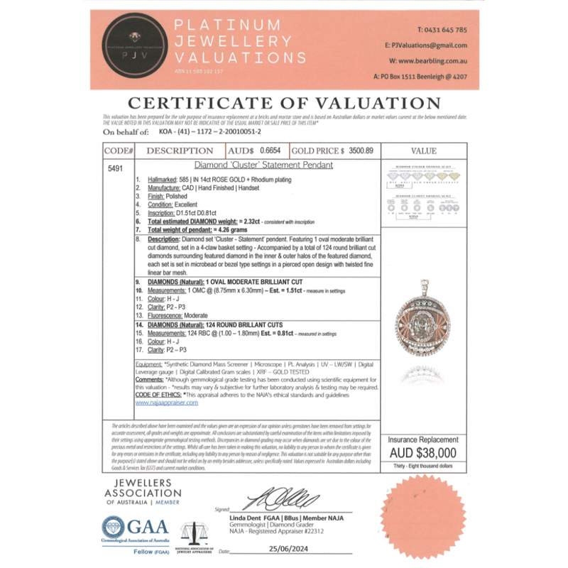 14K ROSE GOLD AND DIAMOND, STATEMENT PENDANT. The Centre Features, One Oval Moderate Brilliant Cut, Diamond (1.51Ct, H-J Colour, P2-P3 Clarity), 4 Claw Set. Encompassing The Design Are, 124 Round Brilliant Cut, Diamonds (0.81Ct Tdw, H-J Colour, P2-P3 Clarity), Micro-Bead/Bezel Set. Valuations Provided by an Independent Third-Party Professional Not Directly Associated With Lloyds Auctions at AUD $$38,000.00This valuation has been conducted by an independent third-party professional. The valuation amount is an assessment by the issuing valuer and does not reflect the auction value of the item. Any inquiries regarding the valuation should be directed to the issuing valuer (refer to contact details on the certificate), as Lloyds Auctions has no affiliation or influence over the valuation, the valuer, or the stated amount. Condition: Good - Refer Images 0645844+5099
