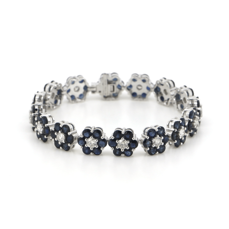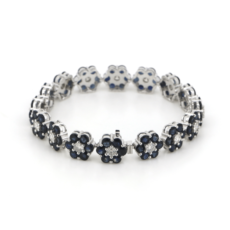 14K WHITE GOLD, BLUE CORUNDUM SAPPHIRE AND DIAMOND, FLORAL BRACELET.