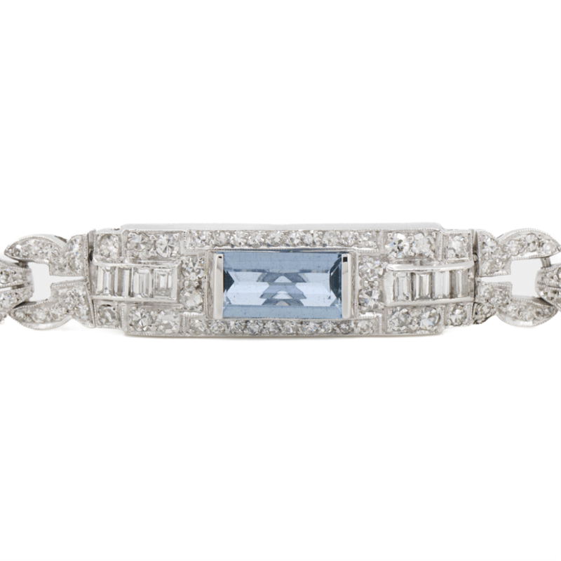 14K WHITE GOLD, AQUAMARINE AND DIAMOND, ART DECO BRACELET. The Centre Features, One Emerald Cut, Medium Blue, Aquamarine (1.19Ct, Light Natural Inclusions Clarity), Bar Set. Encompassing The Design Are, 110 Old Mine And Single Cut, Diamonds (1.20Ct Tdw, H-J Colour, Vs-Si Clarity), Bead/Bezel And Pip Claw Set. Along With, 8 Baguette Cut, Diamonds (0.20Ct Tdw, G Colour, Vs Clarity), Channel Set. Accompanied By, 2 Marquise Cut, Diamonds (0.12Ct Tdw, H-I Colour, Si Clarity), Bezel Set. The Bracelet Features Fold Over Clasp. Bracelet Length Is 18Cm. Valuations Provided by an Independent Third-Party Professional Not Directly Associated With Lloyds Auctions at AUD $$54,200.00This valuation has been conducted by an independent third-party professional. The valuation amount is an assessment by the issuing valuer and does not reflect the auction value of the item. Any inquiries regarding the valuation should be directed to the issuing valuer (refer to contact details on the certificate), as Lloyds Auctions has no affiliation or influence over the valuation, the valuer, or the stated amount. Condition: Good - Refer Images 0645844+5012