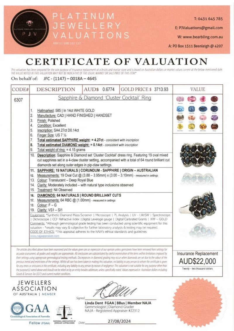 14CT WHITE GOLD AUSTRALIAN SAPPHIRE AND DIAMOND CLUSTER RING FEATURING CENTRE, 19 OVAL CUT, DEEP ROYAL BLUE AUSTRALIAN SAPPHIRES (4.27CT TSW, MODERATELY INCLUDED), CLAW SET, WITH 64 ROUND BRILLIANT CUT DIAMONDS (0.14CT TDW, F-G COLOUR, VS1-SI1 CLARITY), PIP CLAW SET. RING SIZE O. Valuations Provided by an Independent Third-Party Professional Not Directly Associated With Lloyds Auctions at AUD $22000This valuation has been conducted by an independent third-party professional. The valuation amount is an assessment by the issuing valuer and does not reflect the auction value of the item. Any inquiries regarding the valuation should be directed to the issuing valuer (refer to contact details on the certificate), as Lloyds Auctions has no affiliation or influence over the valuation, the valuer, or the stated amount. Condition: Good - Refer Images 0+478
