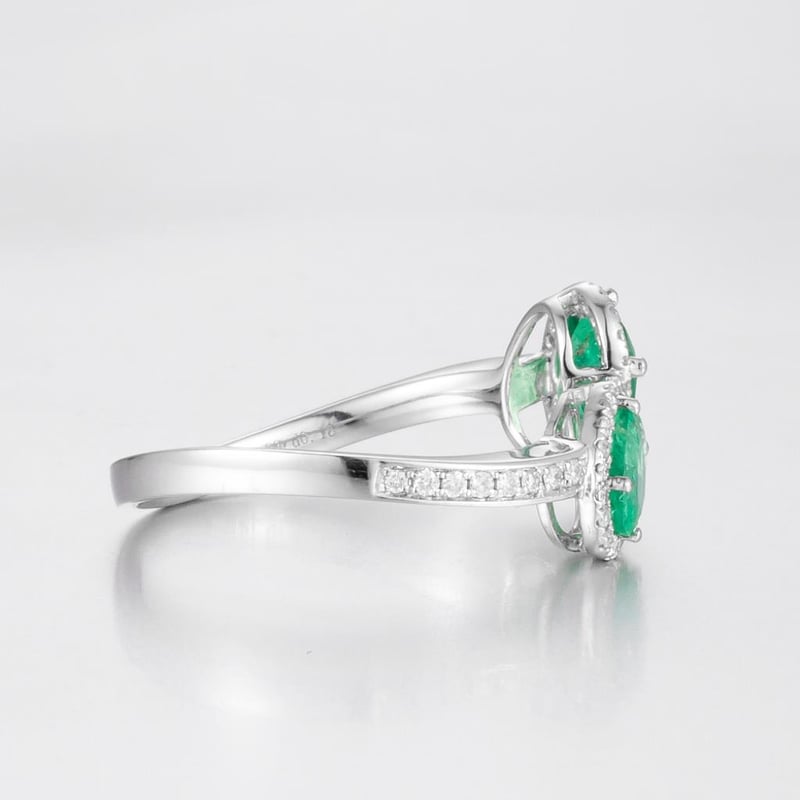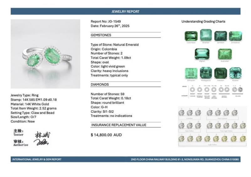 14CT WHITE GOLD COLOMBIAN EMERALD AND DIAMOND DRESS RING FEATURING CENTRE, 2 OVAL CUT CUT LIGHT VIVID GREEN COLOMBIAN EMERALDS (1.09CT TSW, HEAVY INCLUSIONS), CLAW SET, WITH 59 ROUND BRILLIANT CUT DIAMONDS (0.18CT TDW, G-H COLOUR, SI1-SI2 CLARITY), BEAD SET. RING SIZE O. Valuations Provided by an Independent Third-Party Professional Not Directly Associated With Lloyds Auctions at AUD $14800This valuation has been conducted by an independent third-party professional. The valuation amount is an assessment by the issuing valuer and does not reflect the auction value of the item. Any inquiries regarding the valuation should be directed to the issuing valuer (refer to contact details on the certificate), as Lloyds Auctions has no affiliation or influence over the valuation, the valuer, or the stated amount. Condition: Good - Refer Images 0+474