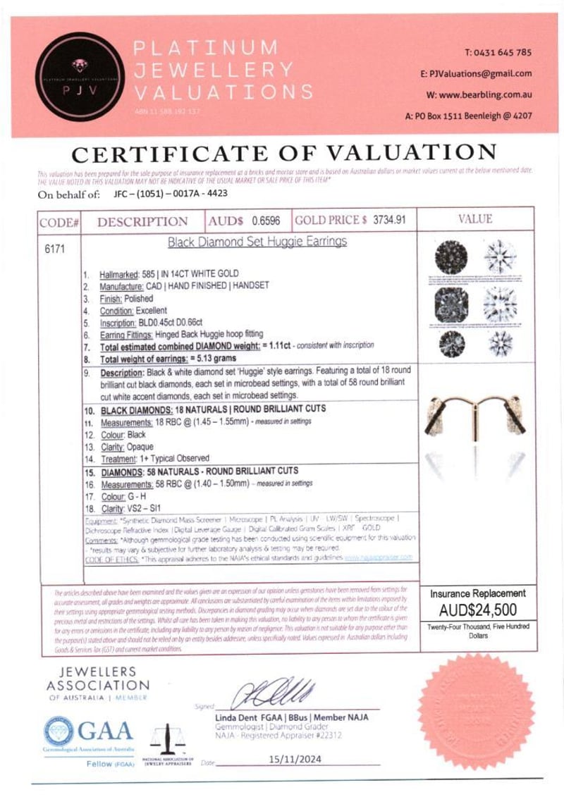 14CT WHITE GOLD BLACK DIAMOND AND DIAMOND EARRINGS FEATURING CENTRE, 18 ROUND BRILLIANT CUT, BLACK DIAMONDS (0.45CT TDW, OPAQUE, ENHANCED), BEAD SET, WITH 58 ROUND BRILLIANT CUT DIAMONDS (0.66CT TDW, G-H COLOUR, VS2-SI1 CLARITY), BEAD SET. Valuations Provided by an Independent Third-Party Professional Not Directly Associated With Lloyds Auctions at AUD $24500This valuation has been conducted by an independent third-party professional. The valuation amount is an assessment by the issuing valuer and does not reflect the auction value of the item. Any inquiries regarding the valuation should be directed to the issuing valuer (refer to contact details on the certificate), as Lloyds Auctions has no affiliation or influence over the valuation, the valuer, or the stated amount. Condition: Good - Refer Images 0+477