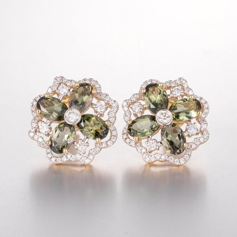 14CT YELLOW GOLD TOURMALINE AND DIAMOND FLORAL STUD EARRINGS FEATURING, 8 OVAL CUT, MODERATE GREEN TOURMALINES (3.74CT TSW, SLIGHTLY INCLUDED), CLAW SET, WITH 120 ROUND BRILLIANT CUT DIAMONDS (0.62CT TDW, G-H COLOUR, VS1-VS2 CLARITY), CLAW SET.