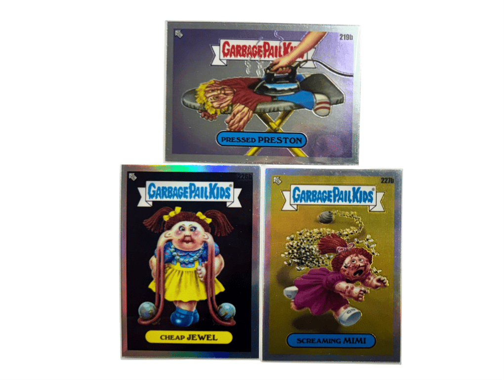 GARBAGE PAIL KIDS CHROME LOT #4 – PRESSED PRESTON, CHEAP JEWEL, SCREAMING MIMIFrom Ironing Mishaps To Accessory Overloads, This Garbage Pail Kids Trio Delivers All The Weird And Wacky Gpk Fans Love. Pressed Preston Gets Flattened, While Cheap Jewel And Screaming Mimi Provide Double The Dolled-Up Trouble.- Garbage Pail Kids Chrome Refractor Cards- Cards: 219B Pressed Preston, 226B Cheap Jewel, 227B Screaming Mimi- Classic Gpk Humor With Reflective Foil Flair584901+48